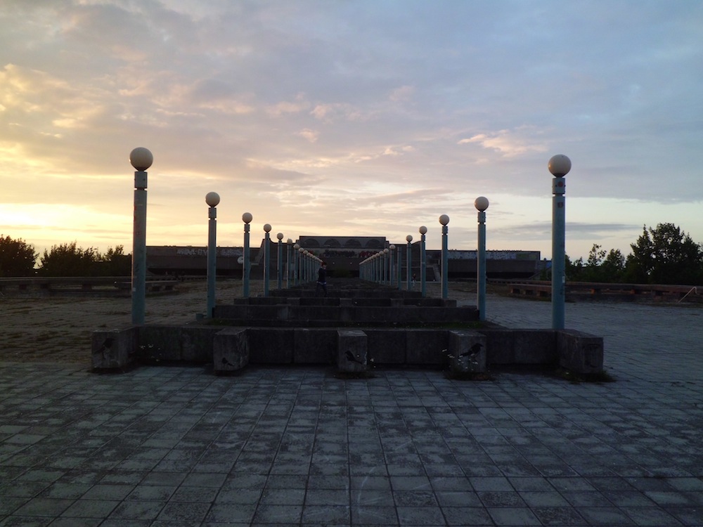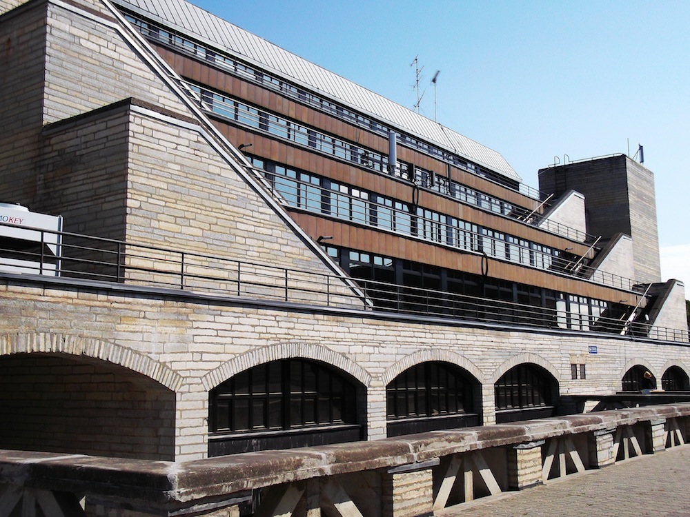 The architect of Tallinn’s National Library, Raine Karp, might just be the most original of Soviet architects (he is still alive, and would probably not appreciate the description)—at least after Melnikov. Karp takes his intuitive sense of form and scrupulousness toward context and amplifies it into buildings that practically become landscape. They do not complement topography but rather are topography themselves. Karp’s best-known building is Linnahall, on a promontory leading out to the Baltic Sea. It’s hard to know exactly where the “building” starts at Linnahall; it’s really a series of platforms, giving visitors a magnificent view of Tallinn’s Hanseatic skyline and the sea, with ships heading off to Finland and Russia. Appropriately enough, given that Cold War theorists considered the USSR a modern reincarnation of “Oriental Despotism,” it elicits comparisons like the pyramids, the Ziggurat of Ur, and the temples of the Aztecs.