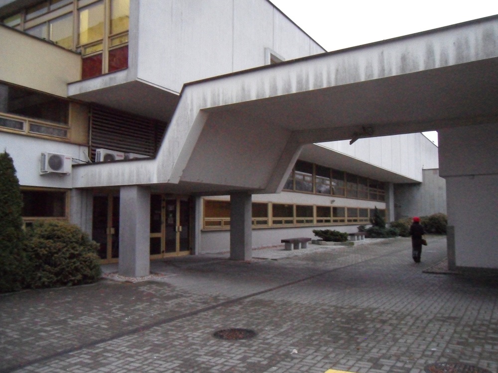 Fijałkowski’s building, by contrast, is somber, murky, and deliberately maze-like; knowledge is presented as a puzzle to solve, not as an open book. You can’t gather that entirely from the facade, which is a clipped and sprawling, stretched-out piece of late modernism. It borrows more than a bit from the Vesnin brothers’ original design for the Lenin Library in Moscow, or their ZIL Palace of Culture in the same city; its volumes spread out across a park—a long curtain-walled glass and marble facade to the street, another to the back of the park, unassumingly grouped around a windowless bookstack. Canopies provide good places to smoke ’round the back and in the corners, and intersecting walkways enclose a quadrangle. The difference between this and the minimal volumes of the Vesnin brothers can be spotted in the panels by the entrance, where an abstract stone relief of indeterminate gaseous and fleshy forms, designed in 1982 by the artist Jan Kucz, is captioned with “Biblioteka Narodowa.” Their cursive lettering, which has seemingly crept in from a Surrealist painting, indicates that there will be more than mere reason at work in this library.