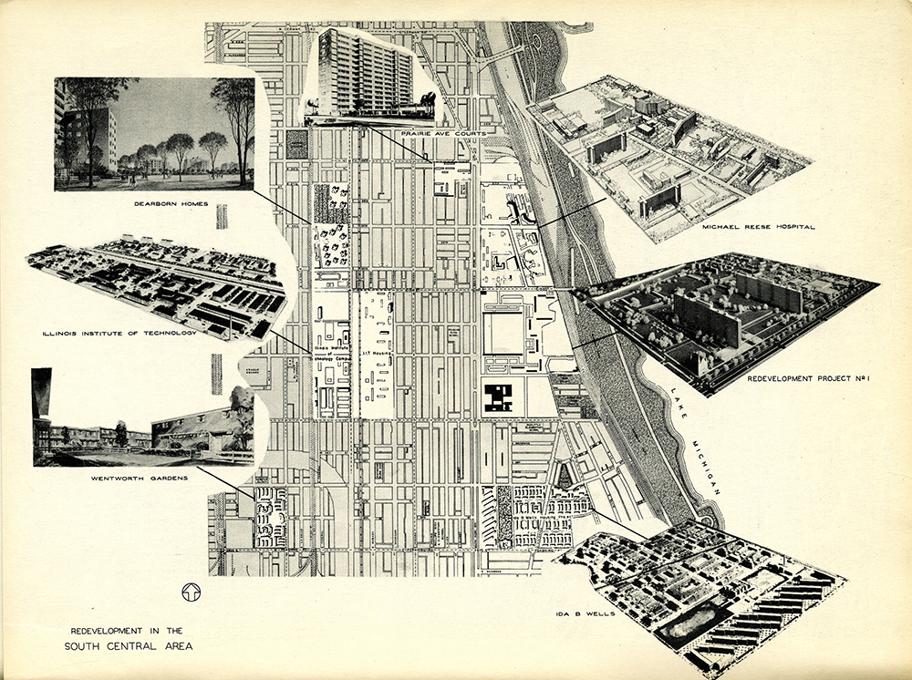 But if not neighborhood planning, then what? As planning director of Michael Reese, Isaacs was deeply involved with Chicago’s Near South Side Plan, one of the few truly modern plans to be implemented in the United States. The South Side Planning Board, which was founded in 1946, was a nonprofit organization initiated by IIT and Michael Reese Hospital that architecture critic Ada Louise Huxtable described—with clear astonishment—as being composed of “Catholic, Protestant, Jewish, Negro, Labor, Railroad, Industrial-Commercial, Real Estate, and Public Housing” interests, all focused on the replanning of a seven-square-mile area of Chicago just south of the Loop.12 The South Side Planning Board wasn’t a government entity; it wasn’t an elected body; it had no given powers. In short, the SSPB was the very model of the civic associations that had so fascinated Alexis de Tocqueville in his trip across America a century earlier: As he had noted, these uniquely American societal organizations enabled, channeled, and also masked various interlocking regimes of economic and political power. The South Side Planning Board was an alliance of academics from IIT and the University of Chicago, business leaders from Chicago’s Loop, and neighborhood clergy and community organizers, even including the editor-in-chief of the Chicago Defender, the country’s most prominent black newspaper. The Board’s resulting Near South Side Plan, developed and partially implemented over the span of about a decade, transformed the area that Huxtable pointedly called the largest slum in North America into a district of modern campuses that included, in addition to IIT and Michael Reese Hospital, a Catholic school, public housing, private housing, and a shopping center.