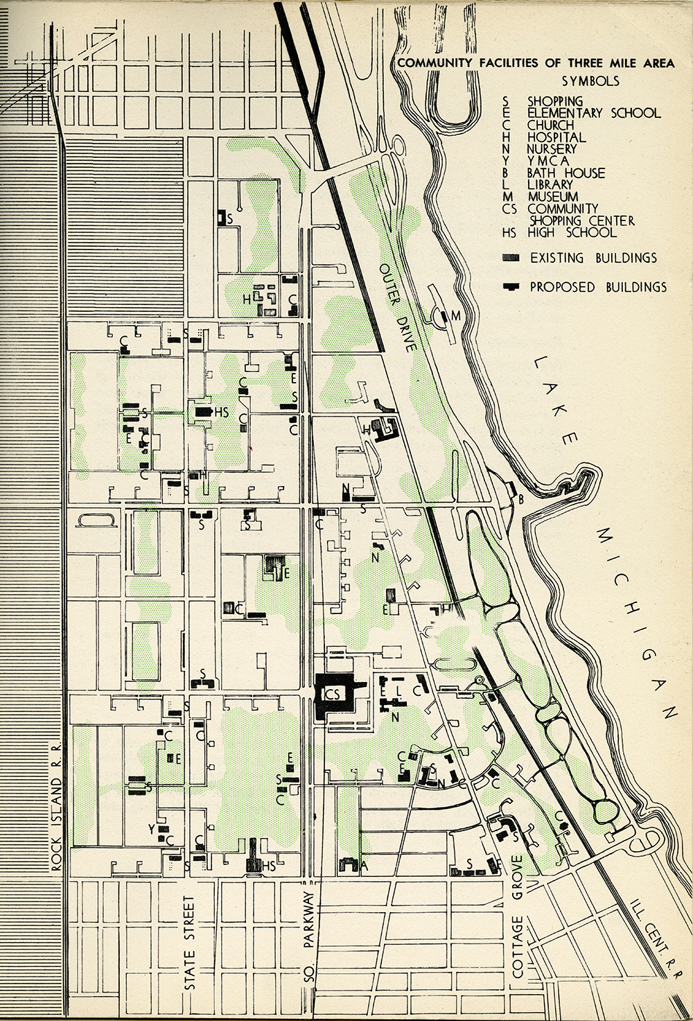 The South Side Plan’s dynamic whole, “Community Facilities of Three Mile Area,” 1947.