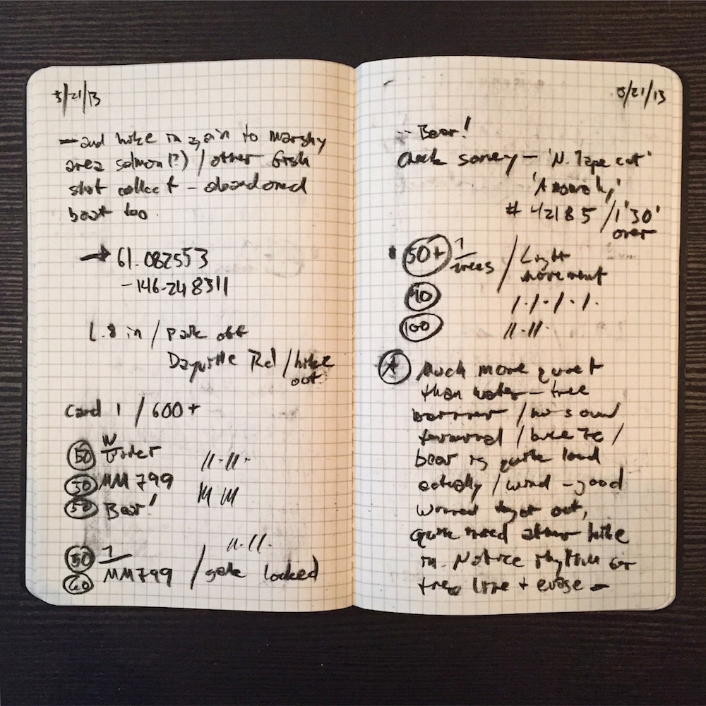 Rappmund’s formal and architectural approach to filmmaking bears traces of cinematic structuralism as well as the influence of avant-garde luminaries such as Stan Brakhage and James Benning, who were his teachers. In Topophilia, this is present in the use of bright orange mile-markers, which appear at regular intervals along TAPS. Operating like a countdown, these signs endow the film with a narrative structure and provide drama. We know that we’re headed toward something. But they also establish a crucial correspondence between actual and filmic time-space. They encourage our awareness of the slippages between the real and its representations when we traverse hundreds of miles in only a few minutes. However, this precise formal attitude is tempered by a more personal and instinctual approach, evident in Rappmund’s expressive treatment of sound and image. This lyricism can be linked to Brakhage. For each project, Rappmund maintains a handwritten journal in which he notes his own emotional state, as well as the day’s weather and light conditions, at a particular site. These notes help determine composition and become a key reference for tone and intention in the editing room. Rappmund, who has a background in music, also produced the film’s ambient soundtrack, which is composed of layered and remixed sound recordings he collected on-site. A recurrent pinging in Topophilia is actually the sound of the pipe’s metal expanding and contracting, which he captured by placing a mic directly on the structure. The soundtrack functions as an animating force, making still images vibrate with a sense of movement and wonder. At times, the soundtrack operates as counterpoint. While the images are animated to represent something close to real time, they are never entirely in sync with the soundtrack. In other words, each sequence in Rappmund’s film references multiple time signatures, which is another way he complicates a seemingly straight-ahead depiction of reality.