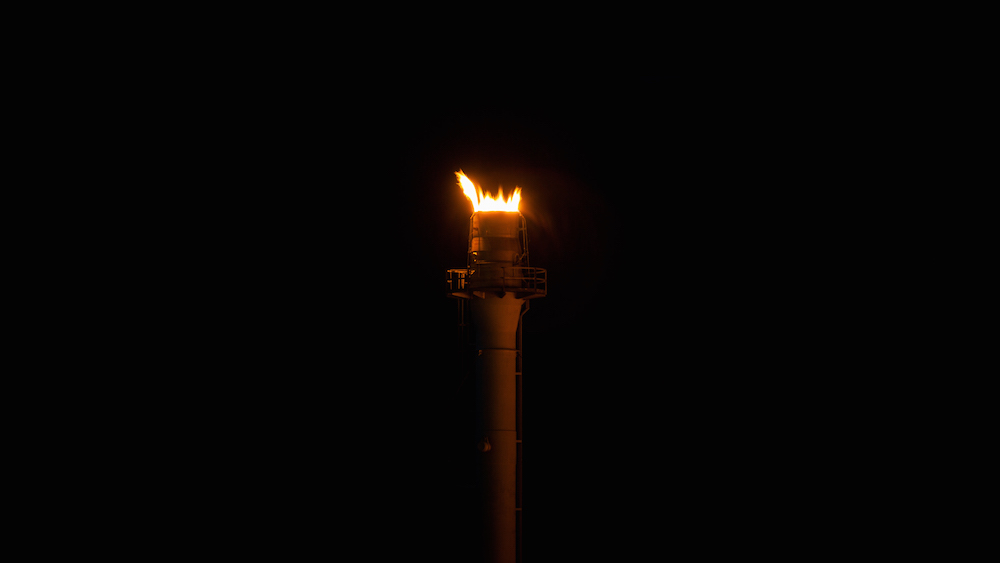 More important to me personally, is the transcendental dimension to Rappmund’s practice. Born of solitary journeys and a meditative process, the films are about connecting on a deep level with the American landscape. They are depictions of systems and processes and therefore circular in construction, even when they appear linear. Psychohydrography culminates in a voluptuous sunset over the Pacific, a visual tour-de-force. In the nearly ten-minute sequence, the stop-motion technique conspires with the rippling water and blazing light to produce a hallucinatory optical effect of looping, endless movement. We are reminded that the life of water continues. Topophilia actually begins in the nearby port of Los Angeles before traveling to Alaska. The location represents the next stage of the journey for the refined oil. But instead of a psychedelic sunset, the film culminates in darkness. After traveling 800 miles, we arrive at Valdez, and the film’s final image is a two-minute sequence of the flame burning atop a refinery stack. It is set against the black void of night, a flickering candle. The image feels sinister and unsettling but also weirdly comforting. An elemental image of fiery light captured on a digital sensor, and brought to life one frame at a time.