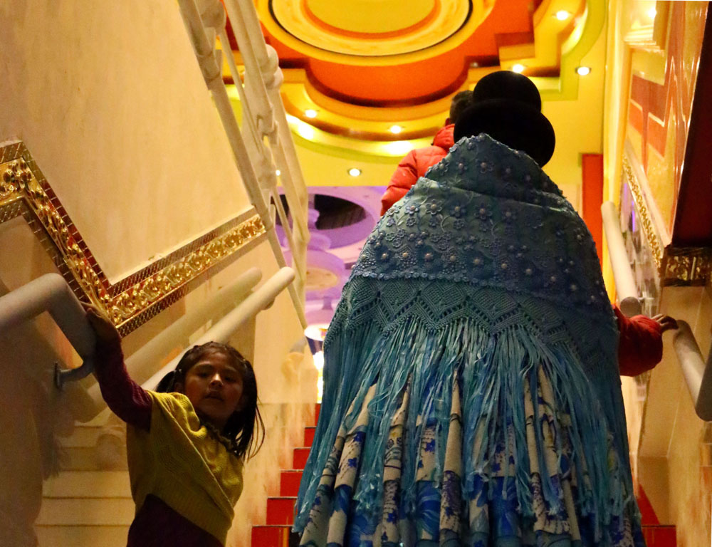 One of the greatest problems with opulence in Bolivia is that for as long as most Bolivians can remember, middle-class life was something that happened elsewhere. You could find it on TV—when watching American shows or telenovelas in which the pale actors bore no resemblance to the average Bolivian. You could locate it in the cities of Argentina or Chile, where Bolivians earn money to send home. But you certainly could not find it in most of the country’s cities. There were two groups with wealth: the elite class—who were assumed to have participated in all manner of deviance, including embezzlement and collusion with foreign companies in order to get their money—and drug traffickers. The idea of people with honestly attained income of an amount that could allow for a dramatic house—a house that represented the pride of the entire family—was almost unheard of. Today, however, due to new jobs programs and an improvement in small-business ownership, this situation is no longer difficult to imagine. Cholets are starting to create a kind of upstart confidence among those who live in the neighborhoods where they have recently been built. While they are not technically a public good (which is almost nonexistent in El Alto), their mere placement on the map has created a sense of pride in quickly built cities like El Alto, where, previously, necessity and utility were everything.