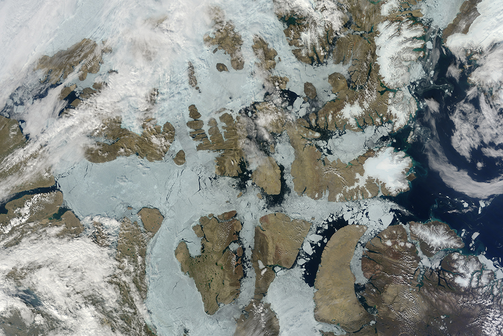 Satellite images—taken on July 17 and August 3, 2012—document the retreat of snow and sea ice in the Northwest Passage of Canada’s Parry Channel, a link in the long-sought northern route for ship traffic between the Atlantic and Pacific Oceans. Produced with NASA’s Terra satellite, by Jesse Allen, Lance system/NASA Earth Observatory.