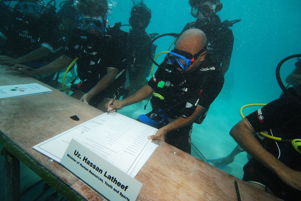 Maldives Underwater Cabinet Meeting protest event, 2009. Image courtesy of 350.org.