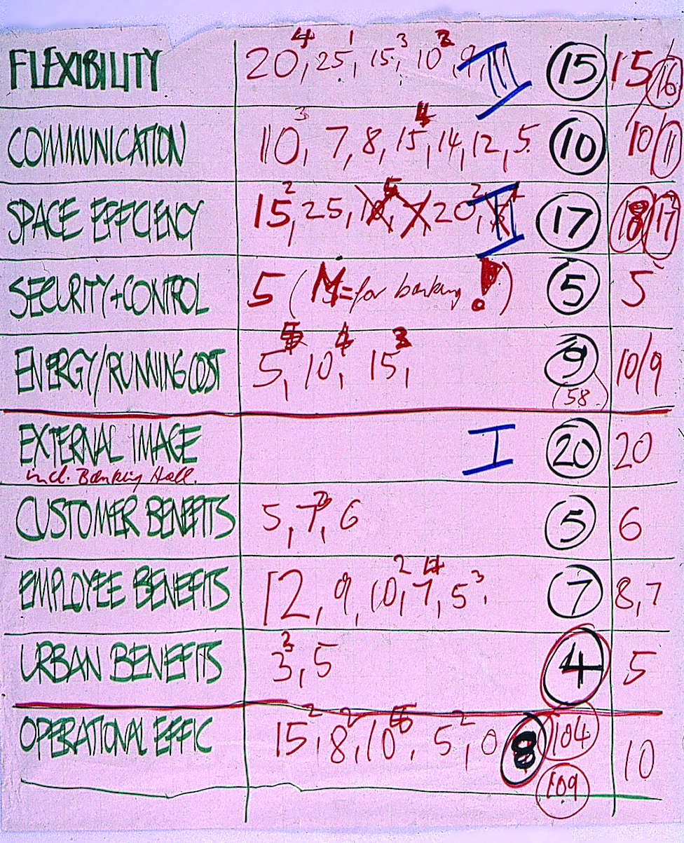 Chart of survey criteria assembled by the Quickborner Team, the space-planning consultant for the Hong Kong and Shanghai Bank Headquarters. Courtesy of Foster + Partners.