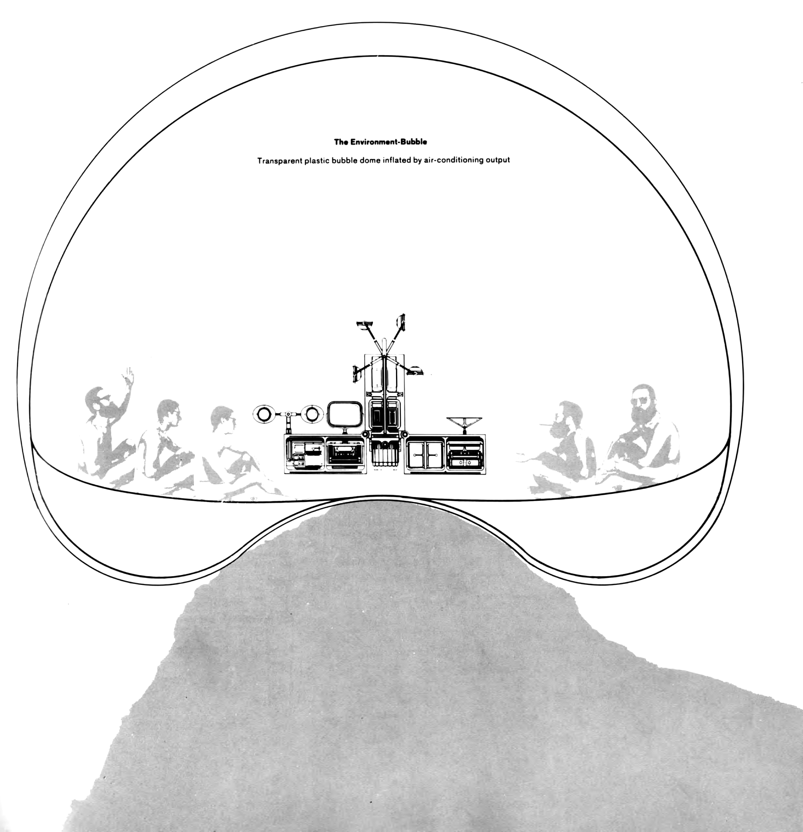 The Environment Bubble, photomontage drawing by François Dallegret for Reyner Banham’s “A Home Is Not a House,” 1965. © Collection FRAC Centre, Orléans. Photographed by François Lauginie.