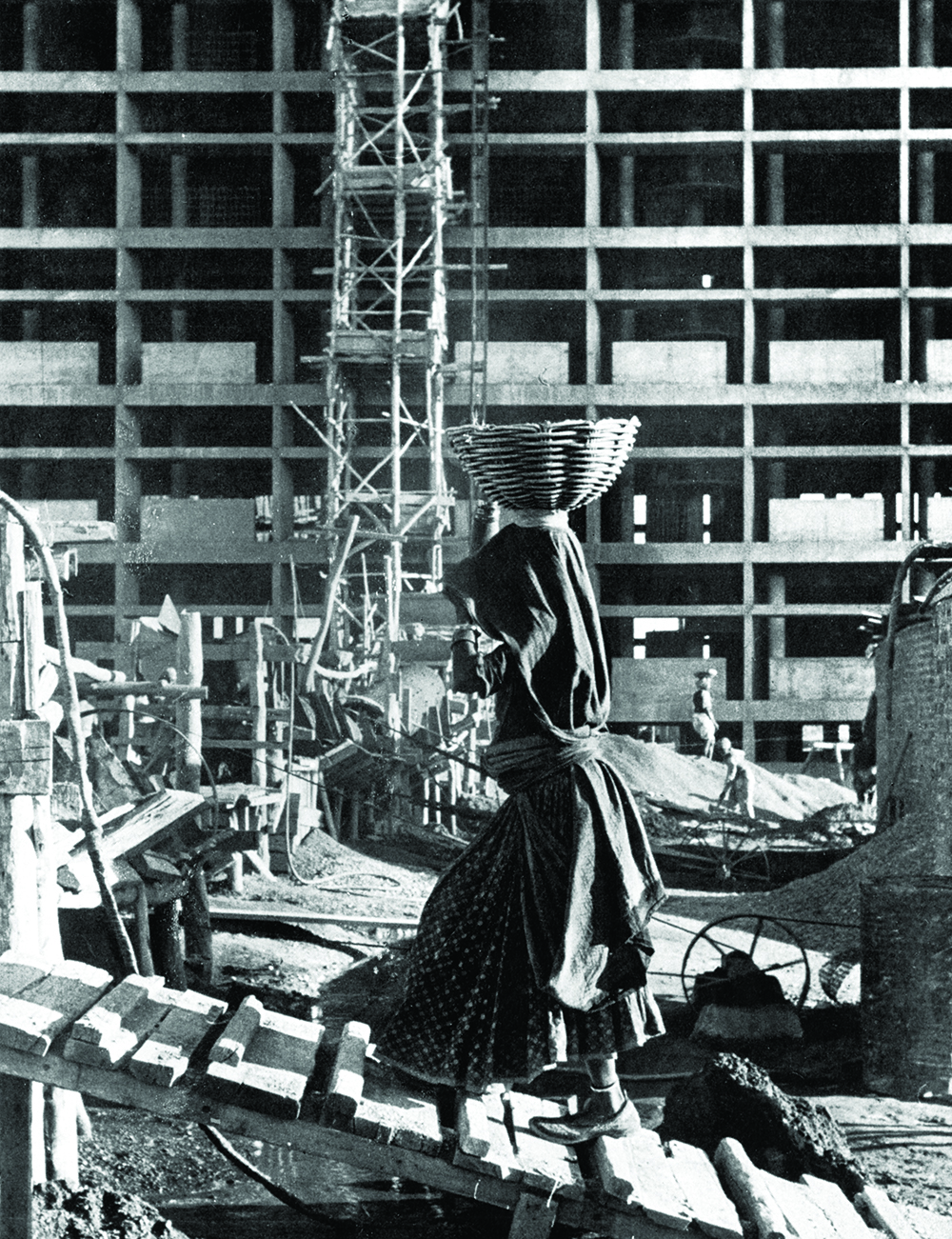 Take an earlier and simpler architectural example, which also has to do with the management of light and air at a building’s outer surface, though with a much different, much more visible sort of filter—the brise-soleil, or sun breaker, that Le Corbusier designed for the Secretariat building at Chandigarh, capital of the Punjab, in 1952. Among the canonical images of this brise-soleil are the construction photographs of the building published in Le Corbusier’s Oeuvre Complète. In his essential account of Chandigarh’s design and construction, Vikramaditya Prakash calls our attention to the rural woman carrying construction materials on her head in the foreground of one of these images. We can infer that she most likely lives on-site, and that her children or those of her extended family are most likely playing in the dirt just outside the frame. Most likely, too, she cannot read—in contrast to the nearly all male, multicultural though probably all English-speaking, and certainly all literate design team—much less interpret the technical drawings passing from the architect’s office to the construction site. There is probably a string of supervisors and interpreters, all male, who translate the instructions written in English on the drawings into oral instructions, probably shouted in Punjabi or Hindi or in a village dialect, that inform her of what to do with the materials she carries.