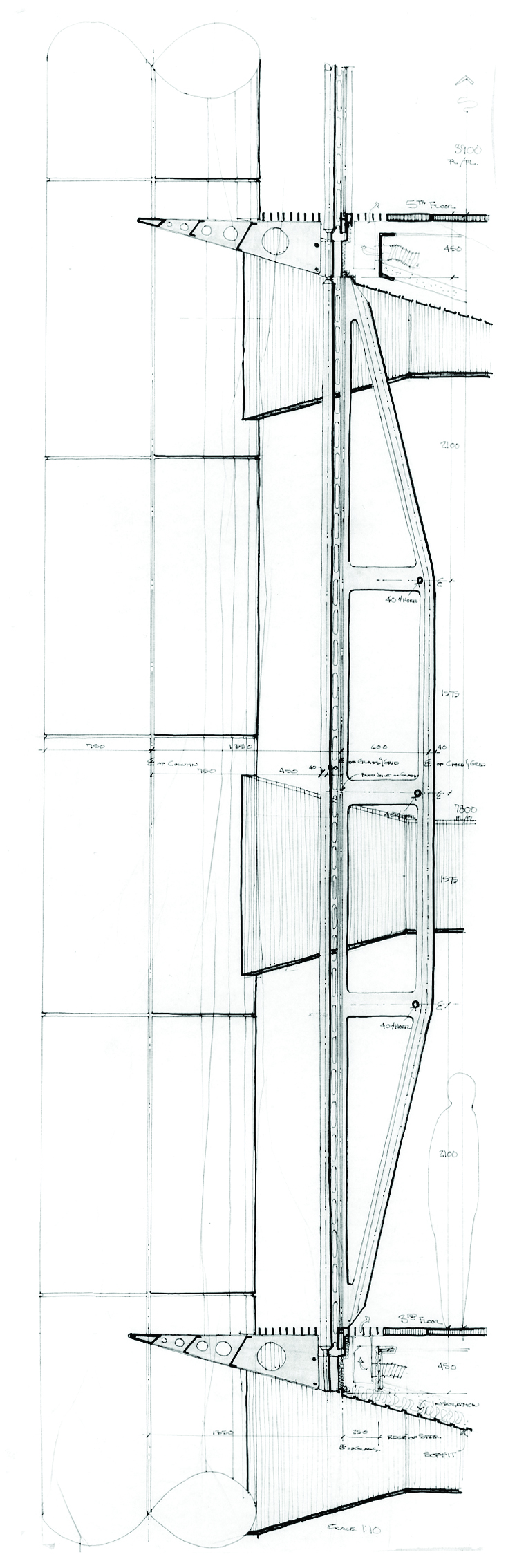 Wind testing for the building was probably the most extensive ever done to that point. Data were gathered on wind direction and velocity in the Hong Kong area, which experiences typhoons on a regular basis. Wind profiles were drawn and topographic models were made for wind tunnel testing, and prototype structural elements were constructed and were themselves measured under projected wind loads. Both the structural frame and the cladding were modeled and tested against the different types of wind data. The exterior wall components that had to withstand these loads were detailed by Cupples Products in St. Louis. Technical sketches, design development studies, construction documents, specifications, and shop drawings had to travel or be otherwise translated from St. Louis to London to Hong Kong and back. As Hong Kong was still a British colony, most of the contractors working on the project were either British or French. So the likelihood that the documents in circulation were mostly annotated in English may not have met with too much difficulty. But it also registered another, related hegemony. As at Chandigarh, it is equally certain that not every worker actually building the building and reading the drawings was able to read English. At some point along the way, translation would be required. This was especially likely given the technical sophistication of the building, to ensure that workers were obeying the drawings’ thoroughly risk-managed commands to the letter.
