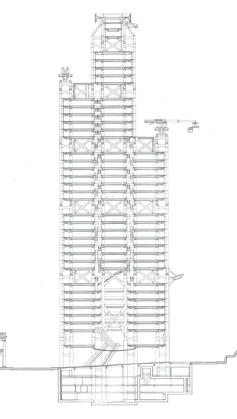 Arup also used their mainframe computer to calculate the building’s superstructure under both static and wind loads. Their structural model comprised some 3,200 nodes and 3,000 elements—minuscule by today’s computational standards. The model was run through finite element analysis to determine east-west and north-south wind deflection. Calculations were also made to test the frame’s ability to withstand what Arup’s published description called a “malicious” event, meaning an explosion or a terrorist attack. In other words: calculated risk.