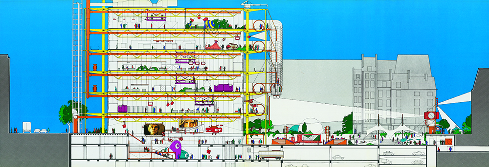 Revised competition scheme for the Centre Georges Pompidou, Renzo Piano and Richard Rogers, Paris, 1972–76; section. © Studio Piano & Rogers, architects.