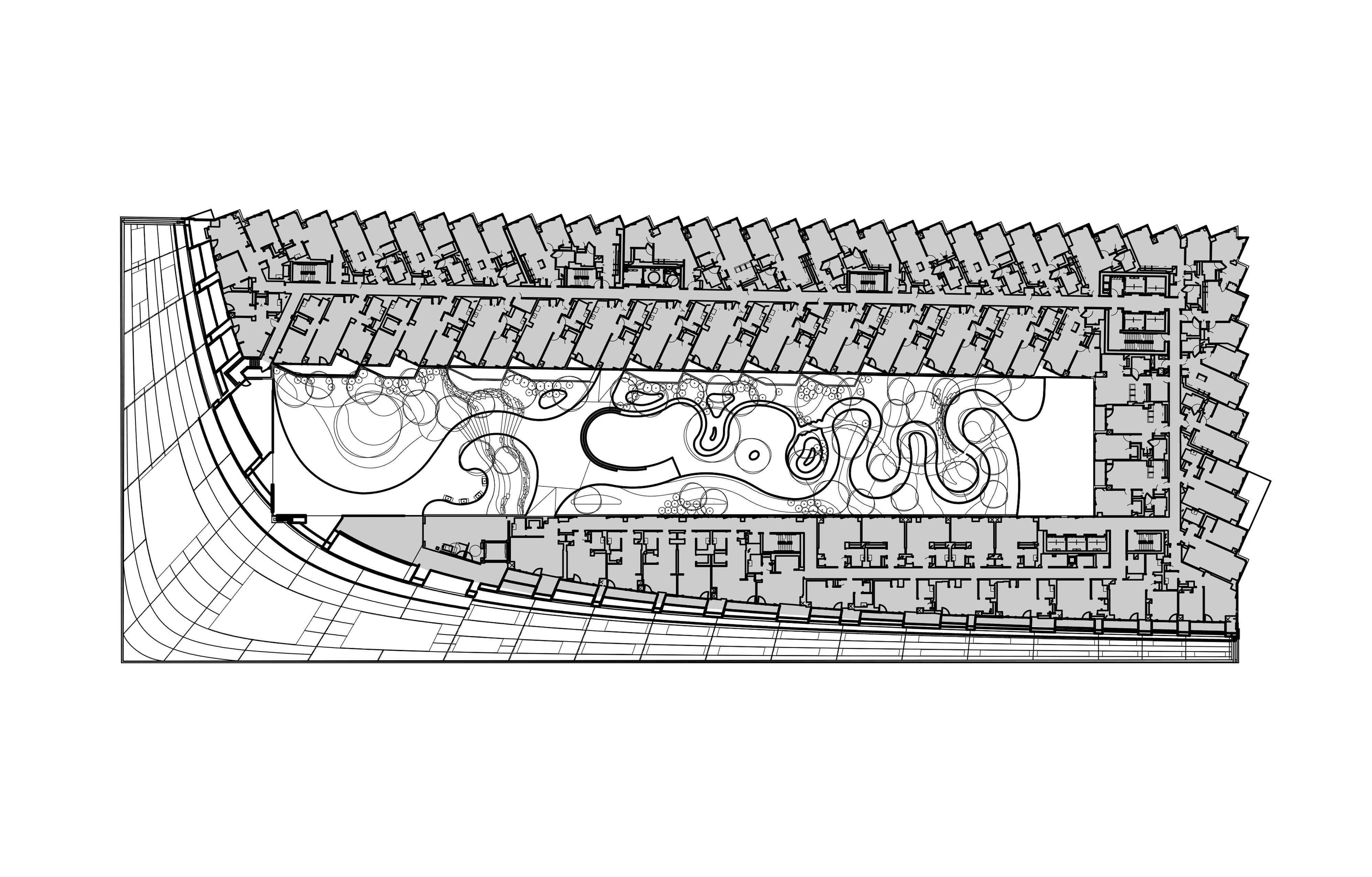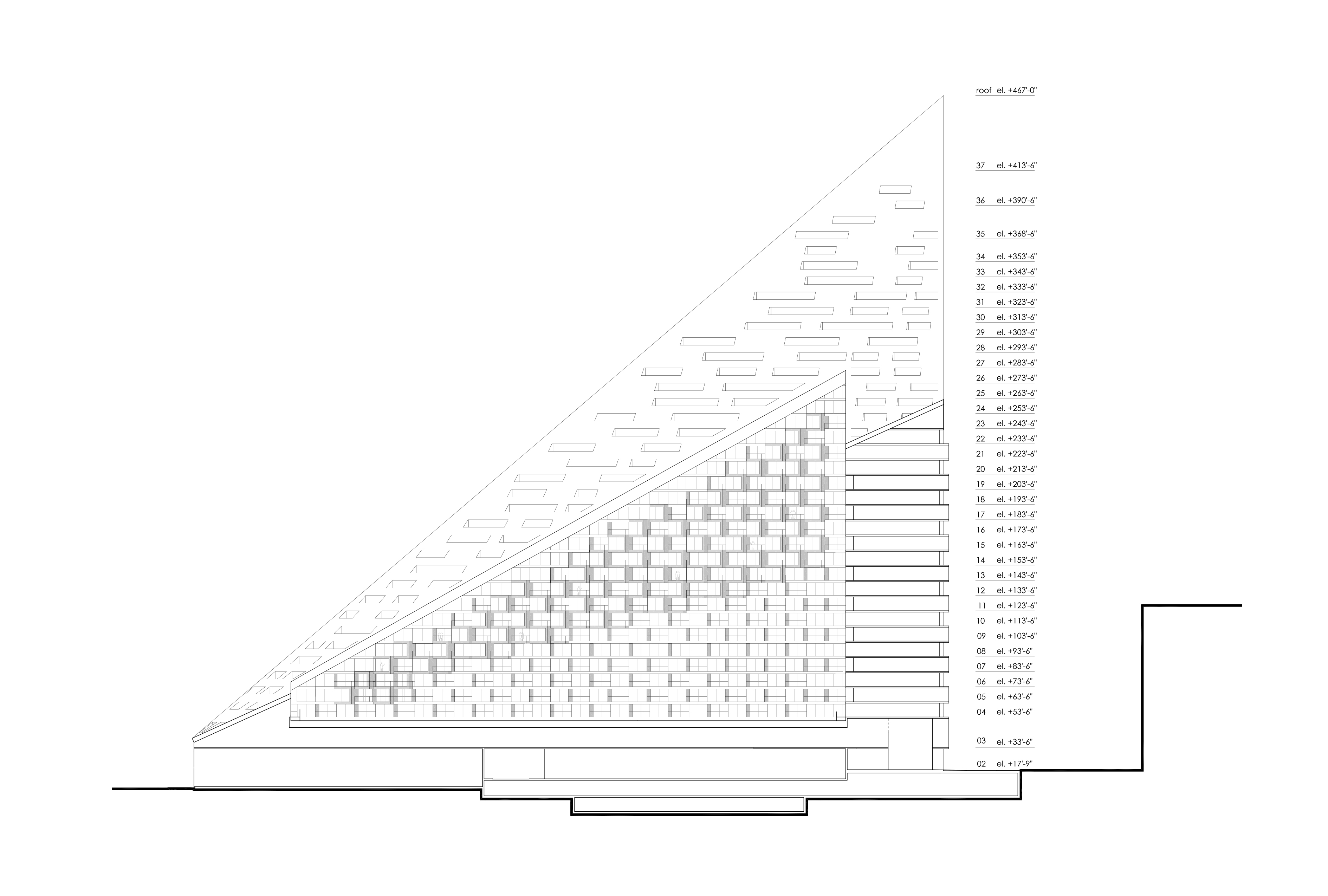 If you have seen Via 57 West in person, it was likely from the West Side Highway or maybe New Jersey. When I first saw the building, from the window of a taxicab, I did a double-take. Just one story tall at the highway, Via pulls up to form an asymmetrical, thirty-two-story tower at the northeast corner of the site. Its matte stainless-steel unitized façade describes a ruled surface, rising from just above street level to 467 feet.5 A giant rectangular cut through the middle of the building produces a courtyard lined with saw-tooth balconies angled toward the Hudson River. There are other curvy structures along the West Side Highway—Frank Gehry’s IAC Building being among the more dramatic—but where those operate within a typical New York City step-back zoning envelope, Via defies it. Immediately, I wondered how such a dramatic structure could have been built in New York, a city whose building regulations and real estate demands often produce cookie-cutter towers.