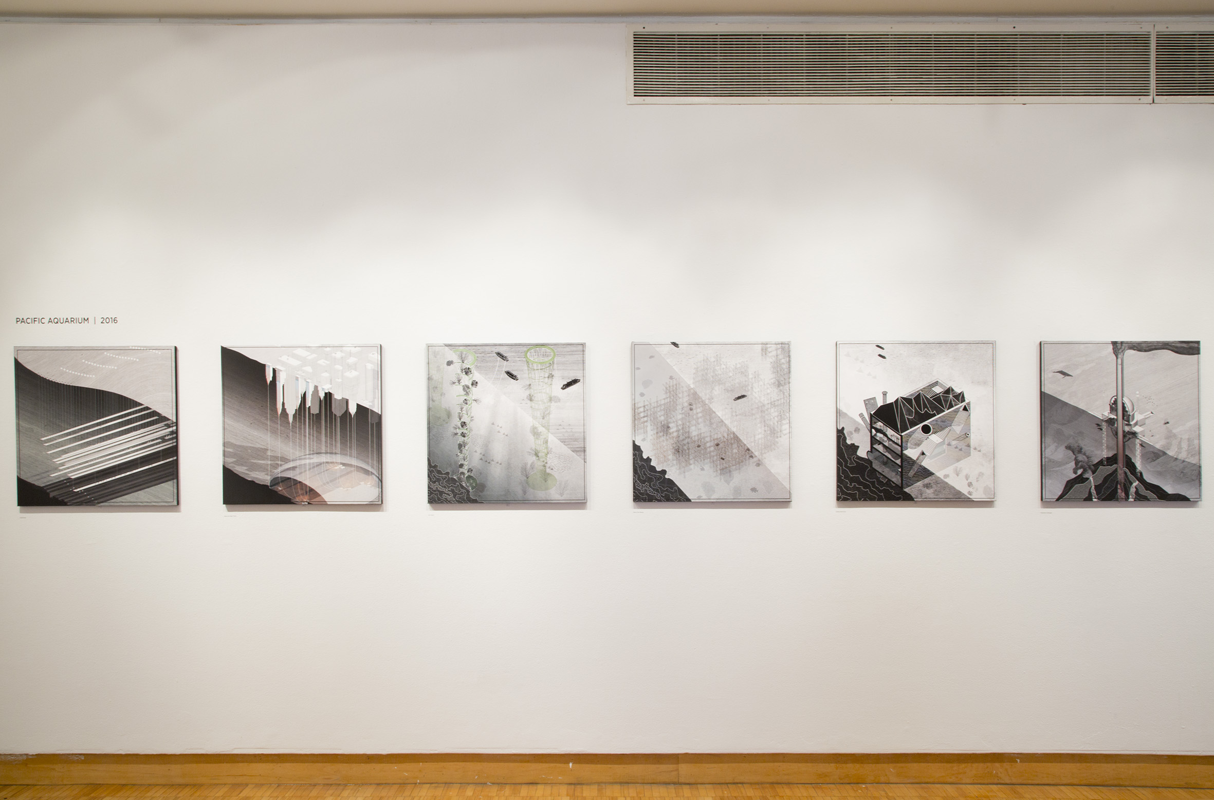 The Pacific Aquarium is Ghosn and Jazairy’s third series on display at the Cooper Union, originally made for the Oslo Architecture Triennale in 2016. It takes “aim at the abysmal distance between our selfish economic worries and the great scales of the Earth,” they explain. Their point of departure is unfamiliar but telling: the Clarion-Clipperton Zone in the Pacific Ocean. This is an underwater basin in the midst of the ocean in which there has been a rush to deep-sea mineral mining. What if the International Seabed Authority, they ask, used their regulatory capacities to mandate a conservation area—a sort of Pacific Aquarium to protect the seabed’s flora and fauna? In the drawings that follow, Ghosn and Jazairy play with what such an absurd underwater aquarium could look like. They depict the iconic skyline of New York, with the Chrysler and Empire State Buildings floating upside down as aquariums. They also turn the Russian Constructivist Shukhov Tower upside down, its tip planted in the seabed to be used as refuge for fish and plants. The scale of these buildings, which at their time were considered extra large, becomes small in the ocean, and the idea of them being a refuge becomes a joke. Indeed, Ghosn and Jazairy have elsewhere argued for the importance of maintaining tragicomic perspective in climate debates to preserve creativity when addressing these issues.3 They allow humor in depicting the mindless destruction of oceanic life. The play with scale is also a play on time. The buildings they depict were once icons of human progress and hope in the future, while in Ghosn and Jazairy’s drawings they become shelters for species endangered by the consequences of ruthless “progress.” Species endangerment also evokes another layer of time, namely evolutionary deep time. The need for a Pacific Aquarium reflects a need to protect deep evolutionary history from short-term human thinking.