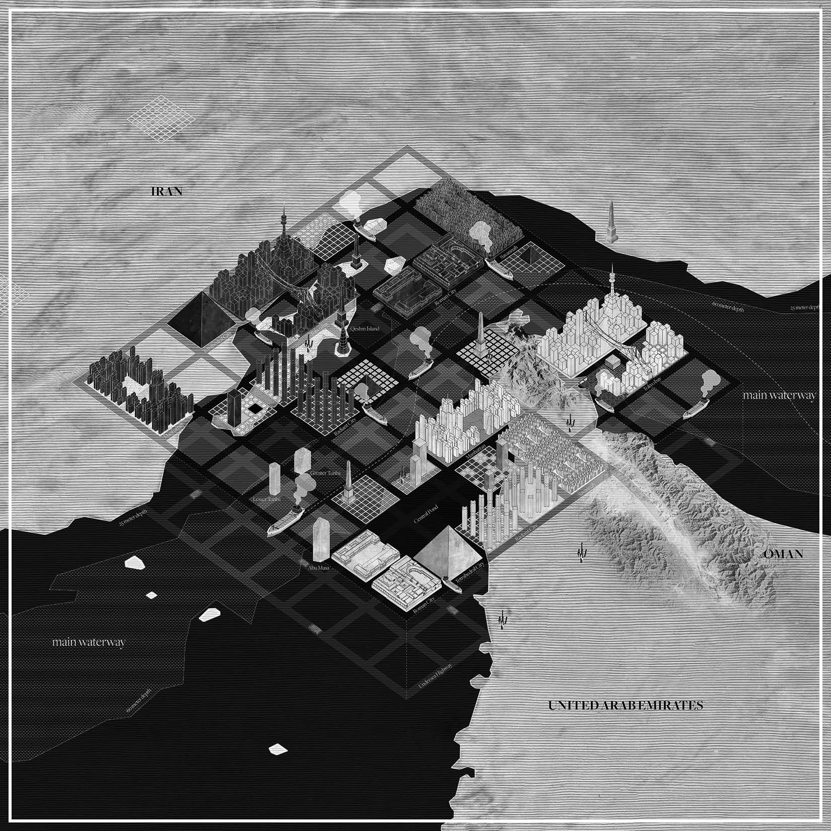 The geostory in the After Oil series is set in the Persian Gulf and moves geographically from oil extraction in Das Island to transit logistics through the Strait of Hormuz, ending with sea-level rise in the flat and low-lying Kuwaiti Bubian Island. At the same time, the drawings move historically from the naïve optimism of natural resource exploration of the nineteenth century, through the territorial politics of the Hormuz Strait, to a dystopian reflection on the end of the petroleum era with climate change.