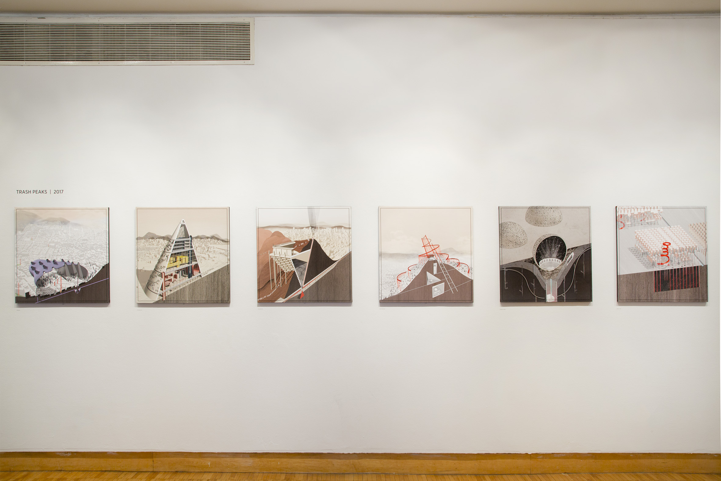 The final project, Trash Peaks, contributes to this apocalyptic vision of how we will live if we do not change our daily habits and building infrastructures, and builds on a previous study of trash by Ghosn and Jazairy published in 2015.4 Made for the 2017 Seoul Biennale, they propose in Trash Peaks a new creative waste management system for Seoul. Their proposal’s elements are as fantastic as they are improbable. The “Plastisphere recycles obsolete plastic waste into a plastidome that hovers on the top of the Changisin hilltop toy market,” Ghosn and Jazairy imagine. A “spiraling tower wraps Seoul’s construction waste of concrete, steel and wood around Mount Namsan.” Again, they use architectural icons of human progress, such as Vladimir Tatlin’s fantastic Constructivist tower to poke at architectural dreams and nightmares.