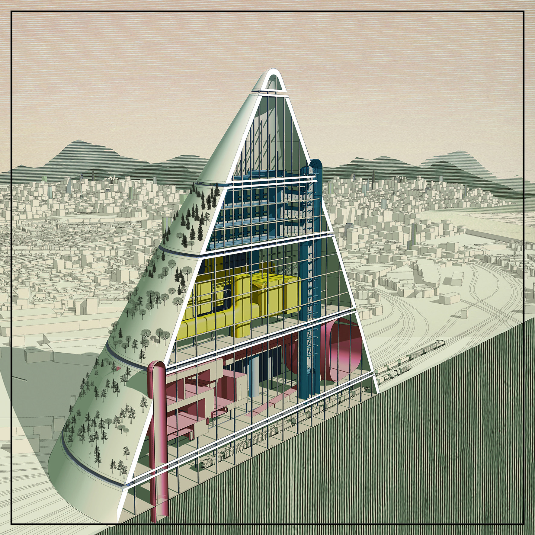 The systems illustrated in their strong graphics, such as the proposed transport of arctic icebergs across the Persian Gulf to be exploited for industrial processes, are not commonly known. Narrating these geostories through architectural drawing explores a renewed design for the public good and care for our environment. The projects expose hidden aspects of global environmental issues and landscape logistics in drawings that act as infographics.