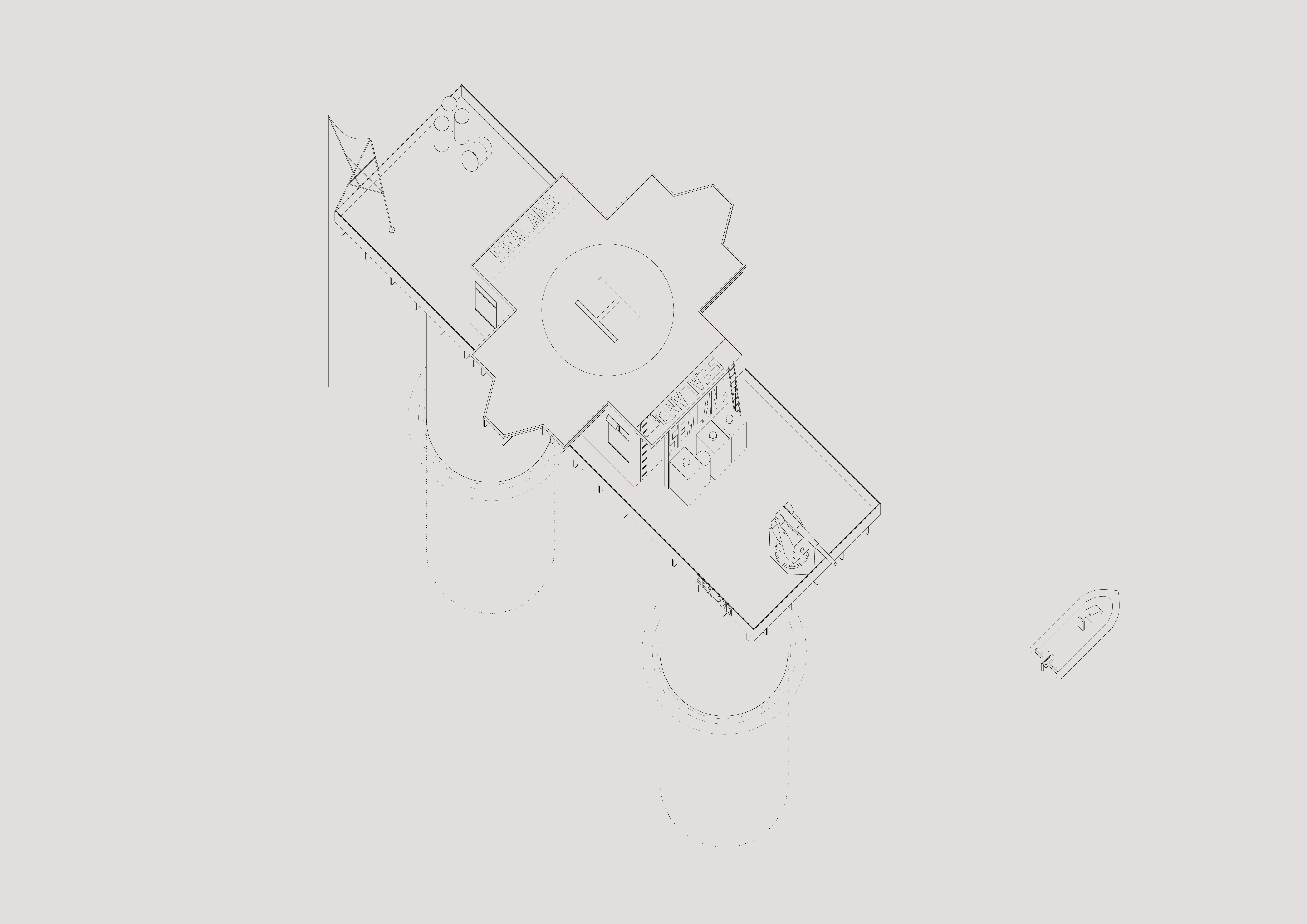 Despite the renovations, Sealand has maintained its unique architectural form. The platform is oriented north to south, sixty feet above the water. On the south end of the deck, a rusty 3.7-inch AA Gun, left from WWII, is still visible. Perhaps it was last used in 1978 when a group of German and Dutch men, led by Alexander Achenbach—a former German citizen and a diamond dealer—attempted to invade Sealand.12 Water and fuel tanks are lined up against the wall of the row (the roofed space between the cabins). Right above them is the unmistakable Sealand logo, painted with large white lettering. A crane, flagpole, radio antenna, and satellite dish stand out among other noticeable objects on the deck. Upon occupation, the octagonal control tower and radar house were removed and replaced by a helipad. Right below the helipad, the roofed space on the main deck level is cut through by a meter-wide corridor; washrooms, bathrooms, and toilets for the crewmembers and the staff arranged on one side; on the opposite side is the kitchen (galley), office spaces, lounge and gathering rooms, and transmitter room. All the rooms are lit by natural light with windows providing fresh air.