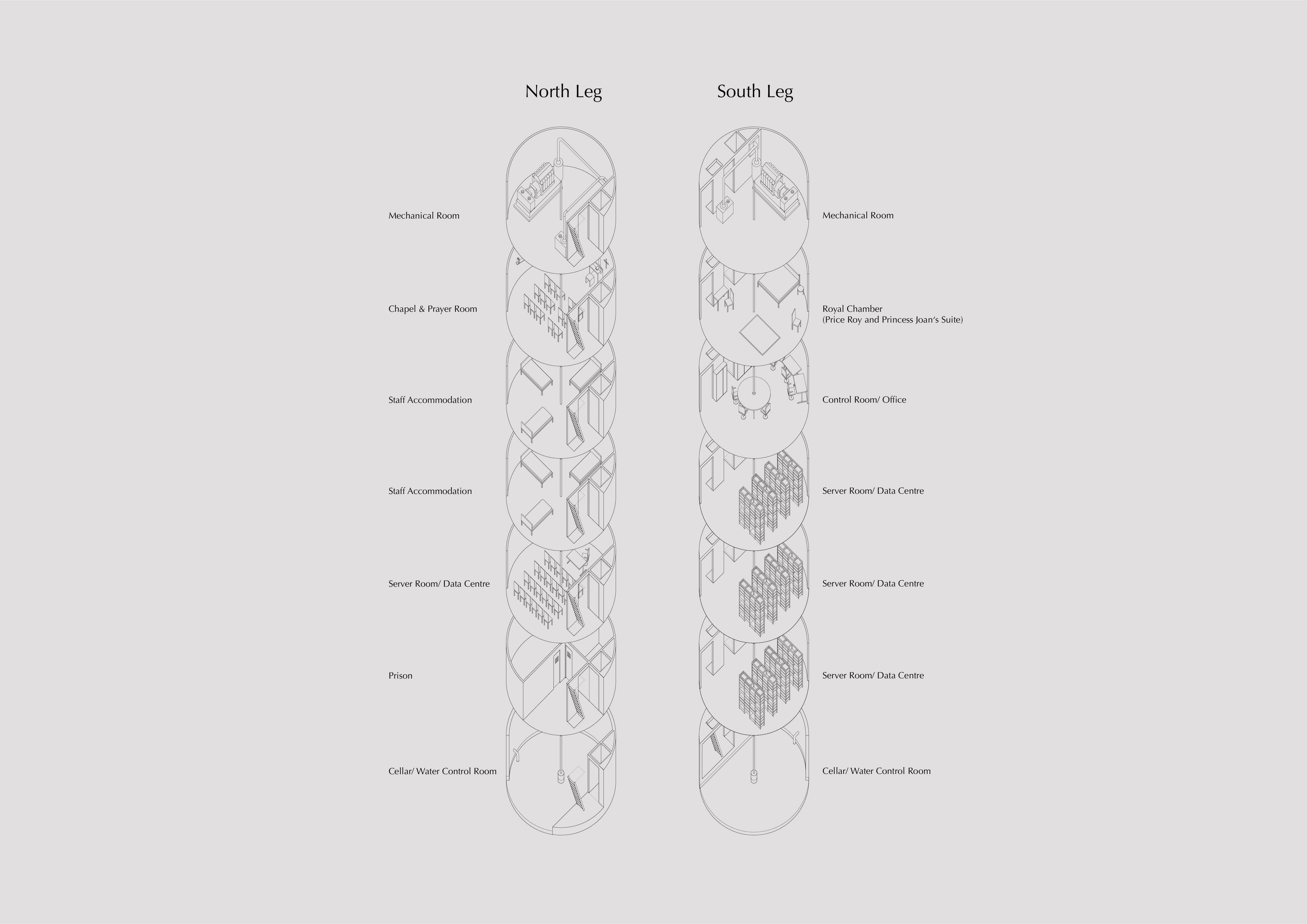 The north leg is dedicated to accommodations for the crewmembers and staff. On the second level, below deck, there is a chapel and praying room: a half-empty circular space with a cross hanging on the wall and a simple desk humbly below. There is a conference room for official meetings and gatherings on the fifth level. At one time the sixth floor was used to store arms and explosives. The one on the north is now a jail while the other is a server room. Their walls are thicker, and the space is divided into smaller parts in order to control possible explosions. Water pumps and safety valves mostly occupy the last floor. The second floor down on the south leg used to be the royal chamber, where prince and princess Bates were housed. Today the room is a UPS (uninterruptible power source) and computer server room, monitoring and controlling the databanks stored in the floors below. Below the server room is a communal workstation. After 2000, a multistory data center replaced the accommodation chambers after Sealand officials formed a partnership with the data haven start-up, HavenCo, to create an offshore data hosting company that would stand outside British restrictions on privacy, copyright, music sharing, and censorship. HavenCo refurbished part of the platform and built the data center.