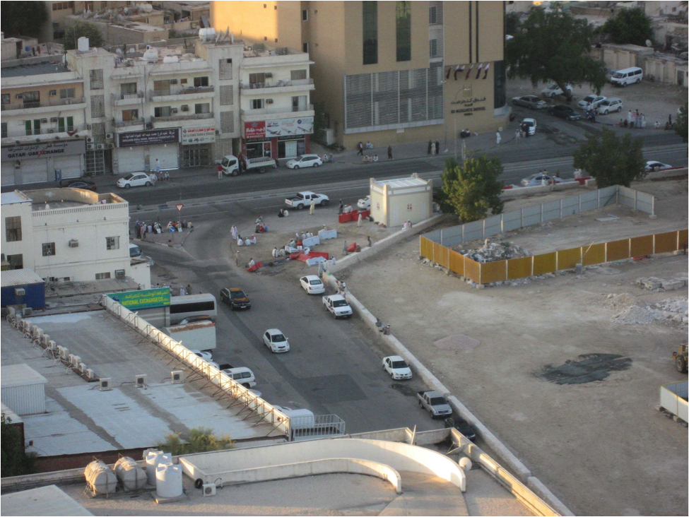The confined space of construction abuts an area of the city that is far denser than these low-rise buildings. Just outside the site’s walls, nearly twenty men sit in or beside the road, some on red-and-white barricades and others beside a yield sign in the middle of the street. Are these men about to start work on this site? Or are they waiting to potentially work elsewhere, on one of the other sites in Doha under construction? If they are some of the 1.4 million migrant workers in the city, which construction sites are they bound to day after day, during their years of contracted, temporary employment?