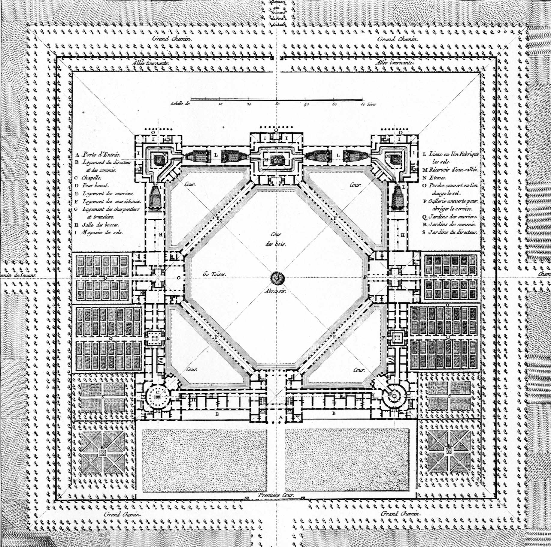 Urban design is not the only point of contact between Ledoux’s and Apple’s product. An abstract principle of autonomy could be seen as a trait d’union between the two, and this refers not only to the unity of design but also to the type of labor carried out in these spaces. In his essay on “Revolutionary Design,” Antoine Picon states that Ledoux proposed the rationalization of production by means of a rigorous spatialization, and that “the idea of surveillance, which was facilitated by the elliptical emphasis, played a crucial role, the gaze of the director being directed in turn at the various stages of the production.”15 But this surveillance, writes Picon, would have proved wholly ineffectual if there had been no consensus between workers and director. Thus, if the ellipse—or rather, the circle—is a form of surveillance, it could also be considered the form of the social contract: “the factory and its environs were the framework for a perfectly adjusted social representation; the ellipse and the circle also referred to the notion of a community that was transparent.”16 The same transparency was invoked by Jobs, who has stated that he designed the campus as an amphitheater, which should be a symbol for sociability.17 Although Apple Park hosts a different kind of community of production—a community made up of immaterial workers—it shares certain similarities with the Royal Saltworks of Chaux.18 But if the second project for the Saltworks—an ellipse-shaped figure—was morphologically akin to the Apple ring, then the first one—a building shaped like a castle—reveals a deeper typological analogy still. Here, all of the factory facilities were arranged in a continuous quadrangular body, creating, according to Antony Vidler, a “type form” that unified all of the community’s needs within a unique diagram—just like Apple’s circle.19