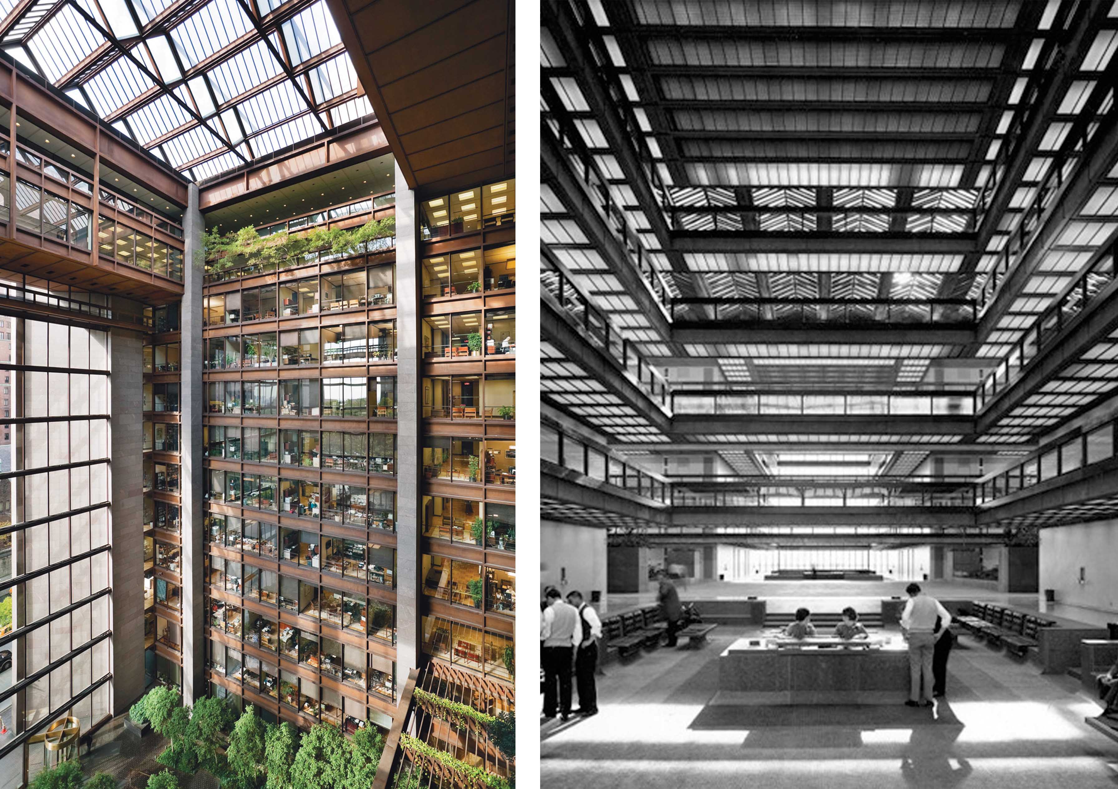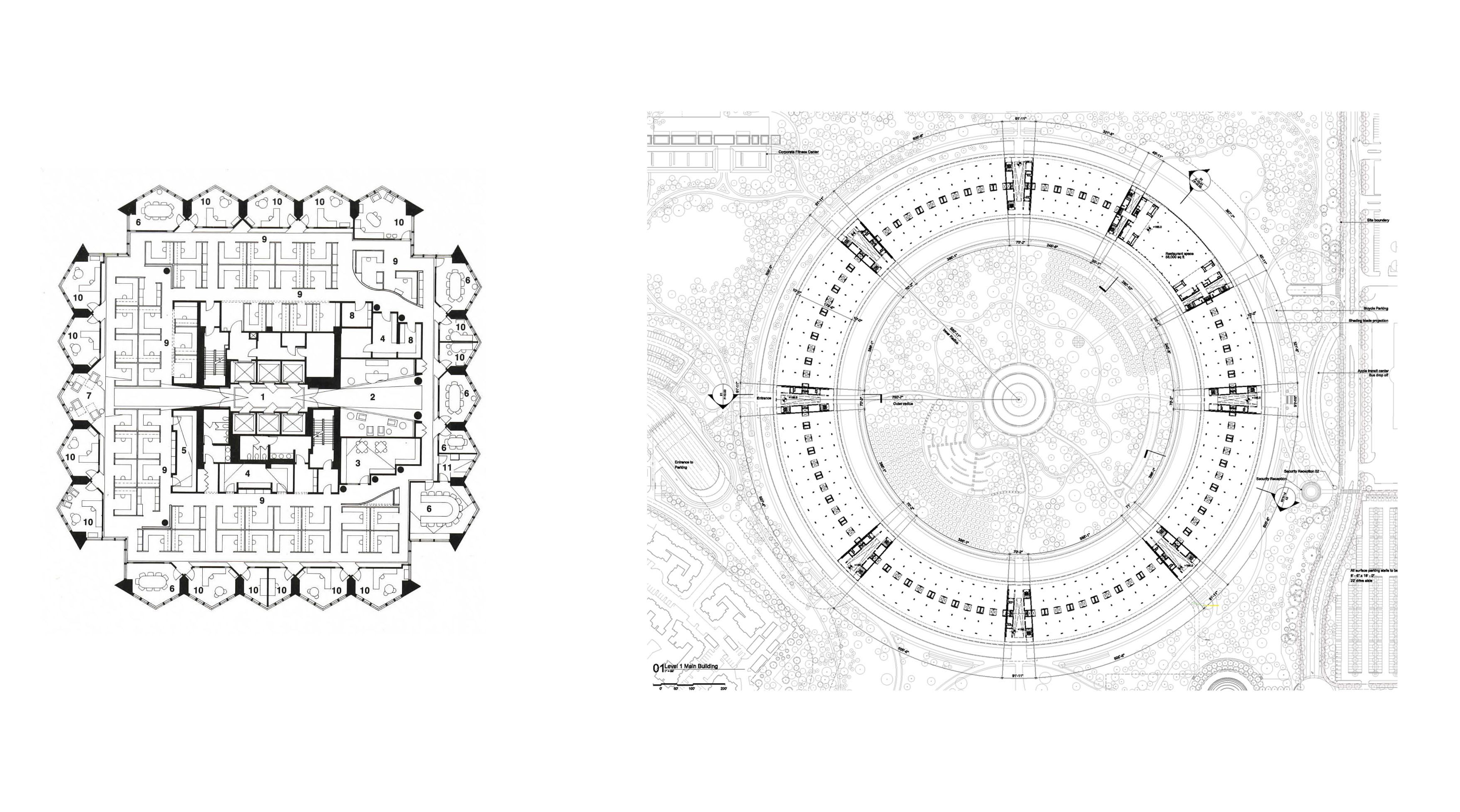 We can trace the origins of this inward-looking space to two American corporate campuses, the Bell Telephone Laboratories at Holmdel, New Jersey (1962), designed by Eero Saarinen and Associates, and the Ford Foundation Headquarters in New York (1963–68) by Kevin Roche, John Dinkeloo, and Associates. The workspace at Bell Labs was entirely artificially conditioned; corridors lining the external curtain-wall encompassed laboratories and offices, as in the case of the ring of Apple Park. The most engaging point of comparison is found in the earliest sketches made by Saarinen, which can be viewed as a set of topological studies intended to investigate the relationship between inside and outside, contiguity and separation. Whereas the final proposal was arranged around a cruciform atrium, early models were distributed around an open, central space.11 Although the Bell Labs project as-built ultimately deviated from these initial sketches, the early proposal for a green atrium, equipped with tropical plants, is mirrored years later in the plan for Apple’s hortus conclusus.