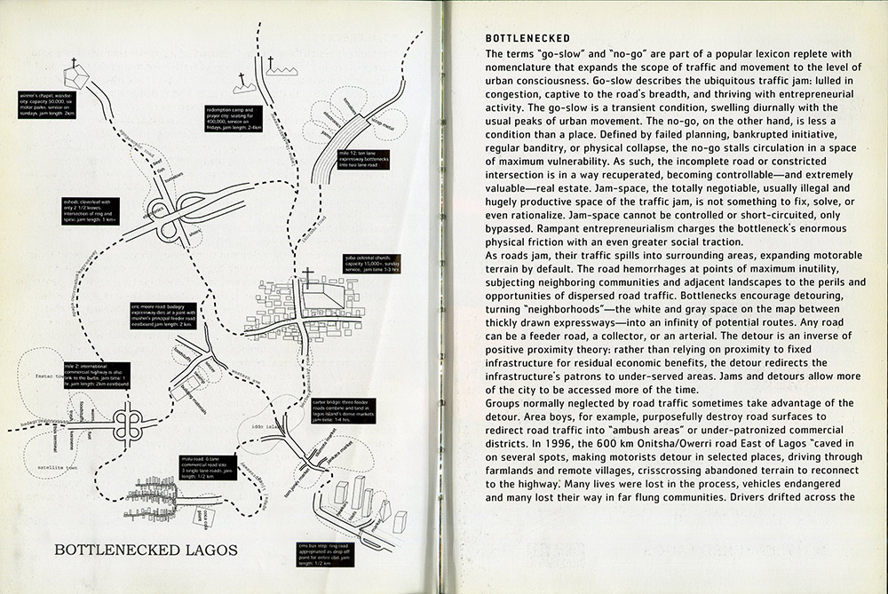 Bottlenecked Lagos: megachurches and their associated traffic jams. Spread from Mutations by Koolhaas et al. and published by ACTAR, 2001.