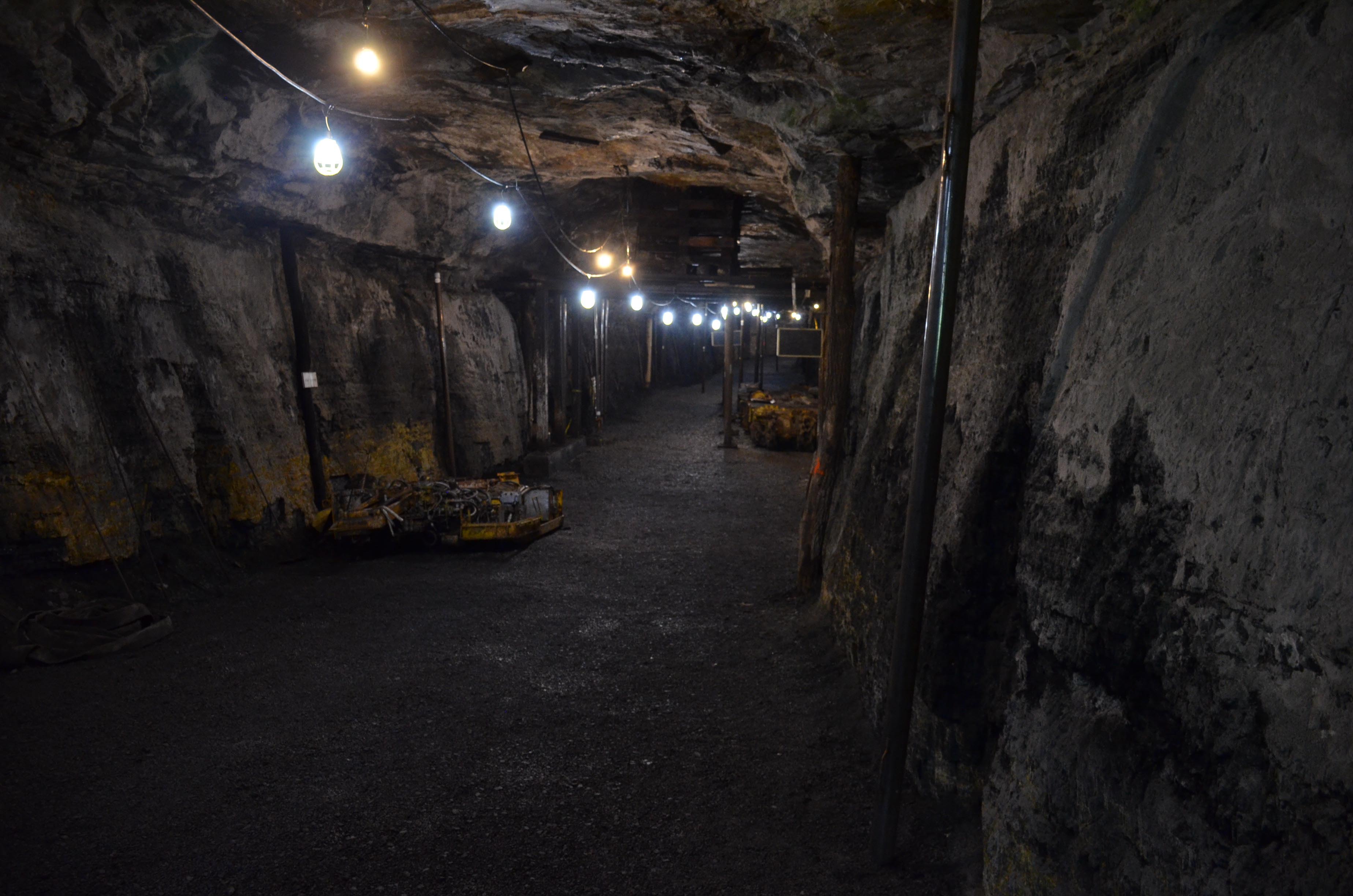 “I keep this door closed for dogs, kids, and bears,” our guide, Tammy, tells us as she opens the portal for the day. On the inside of the gate is a painting of a mule, memorializing the mine’s three hundred nonhuman laborers. The walking route makes a loop and exits through a different portal, likewise marking out a history of mining techniques and preserving some of the geological oddities—fossilized fish, kettle bottoms—that pervade the mines. In the 1960s and ’70s you could drive through the exhibition mine (the exhaust of the cars ended up eating away the varnished protection of the coal), and the signage and displays are still arrayed for vehicular viewing. This is decidedly high coal, with a range of around twelve to fourteen feet in height, and its proximity to the grade level of the valley outside made for comparatively easy work, if one could say such a thing about such hard and dangerous labor.