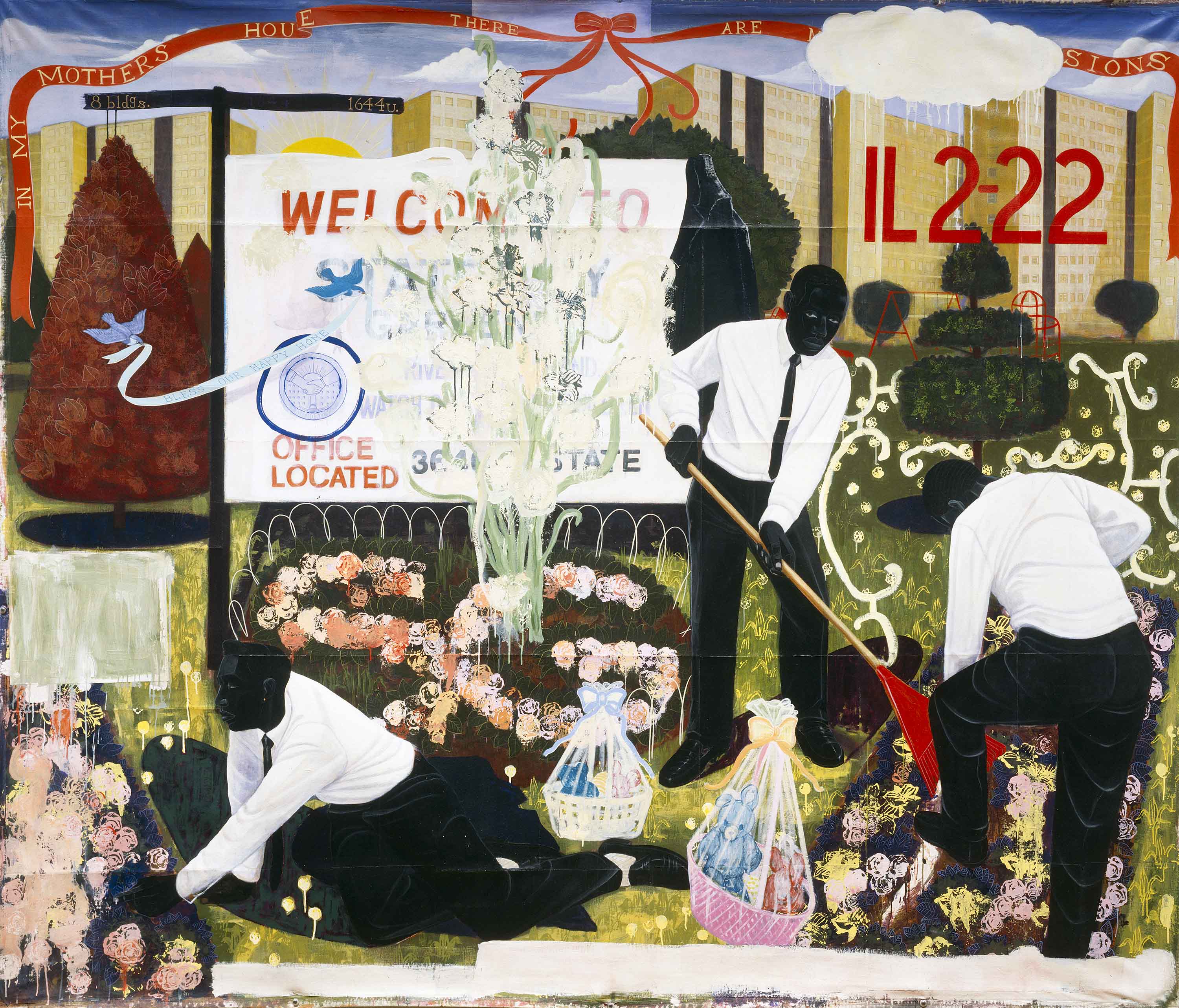 Cabrini-Green did have its moment in the sunlight. Despite the conflicts raised by its racial and economic integration, people had once desired to live there, and the project was described as a dream, a “leap into the middle class.”12 Aspiring, middle- and working-class black families who had arrived at the start of the project without any other satisfactory residency options to turn to (due to housing discrimination) had reveled in the majesty of their “lordly” views of the Chicago skyline, breezy mosquito-less walkways, and powerful heating systems.13 Kerry James Marshall, a former public housing resident himself, captures that ephemeral, but stolen, sense of opportunity and possibility held by black Chicago public housing residents in his paintings Many Mansions (1994) and Past Times (1997). These works portray a more idyllic sense of what the tower-in-a-park public housing had once been and could be but wasn’t: blooming flowers, manicured lawns, birds flying in sunny skies that almost twitter from the canvas, a picnic and music and images of black subjects at leisure (cricketing, golfing, swimming, water-skiing), with the towers lingering far in the background. Following bell hooks’ book Black Looks, in which she states that “Unless we transform images of blackness, of black people, our ways of looking and our ways of being seen, we cannot make radical interventions that will fundamentally alter our situation,”14 Marshall re-asserts and reclaims public housing as a site of subjectivity on behalf of black residents in his paintings, visually inverting the centrality of modernist buildings to residents and place in visual discourse. To draw from Foucault writing on architecture: