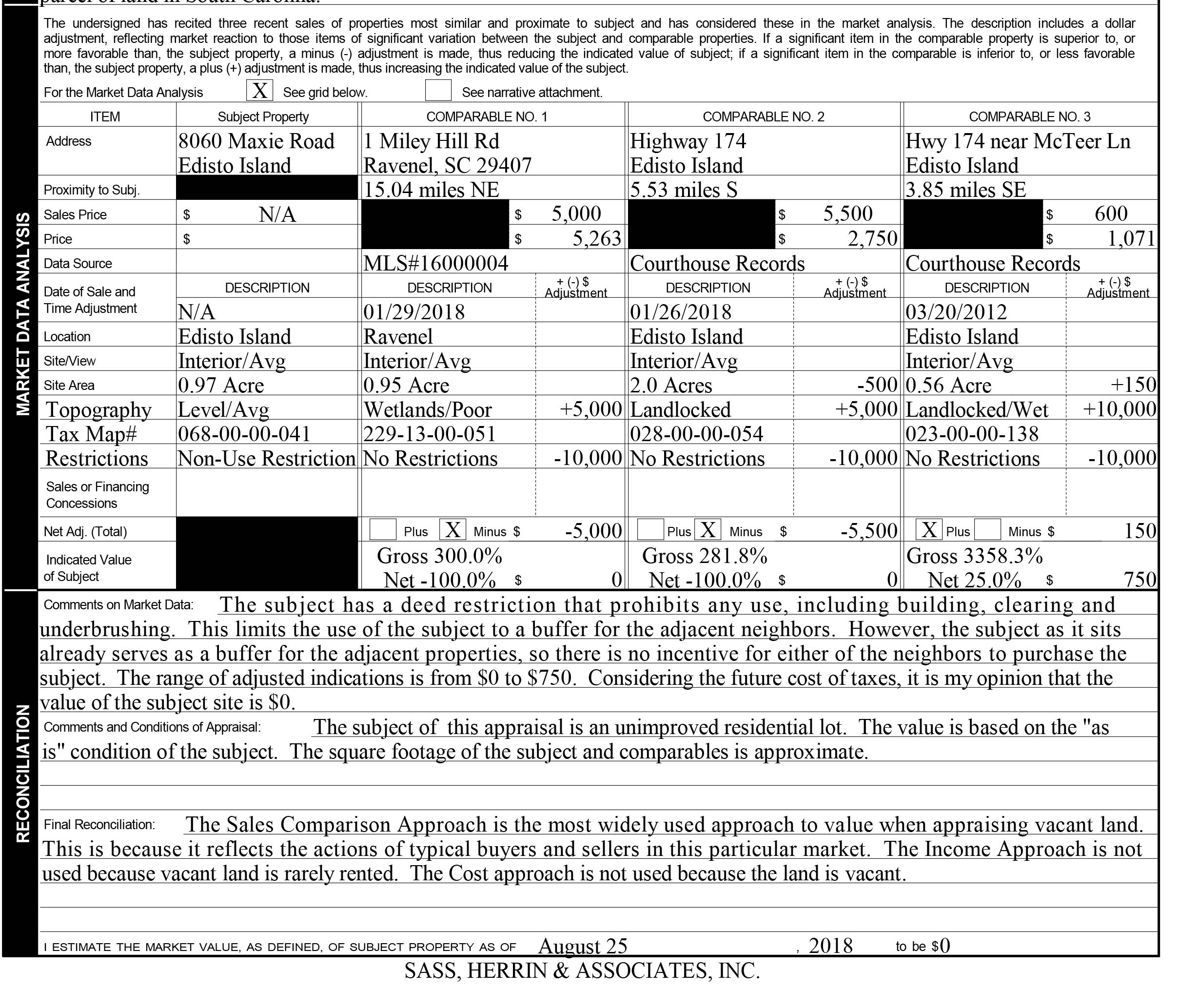 The one-acre piece of land at 8060 Maxie Road, Edisto Island, South Carolina, was part of the Maxcy Place plantation. This land was purchased at market value on August 6, 2018, by 8060 Maxie Road, Inc., a nonprofit company formed for the sole purpose of buying this land and recording a restrictive covenant on its use. This covenant has as its explicit purpose the restriction of all development and use of the property by the owner.