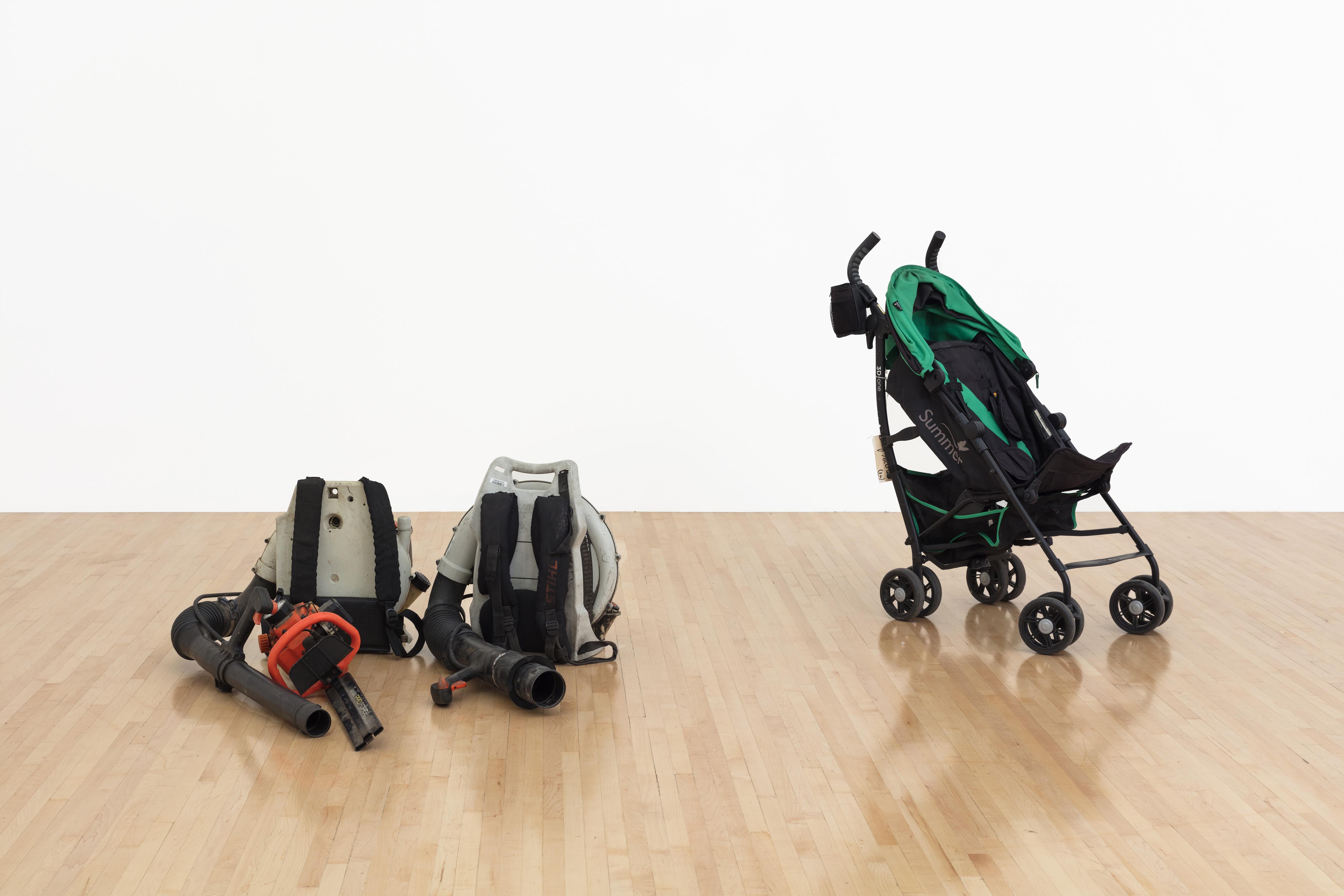 If his text is maximal in content, his installation is absolutely ascetic, exacerbated by the airlessness of the gallery. A concise sequence of objects and documents are distributed around the perimeter of the room. What commands the mise en scène is an ensemble of humble objects. Two bundles of bicycles lean against opposite walls, two portable leaf blowers and a hedge trimmer sit on the floor, and a single stroller is parked nearby. It is an offbeat assortment of things, each visibly worn with use and each conjuring some form of human mobility. The items capture an awkward temporality, as if they—and/or their previous owners—were en route somewhere, though intercepted along the way.