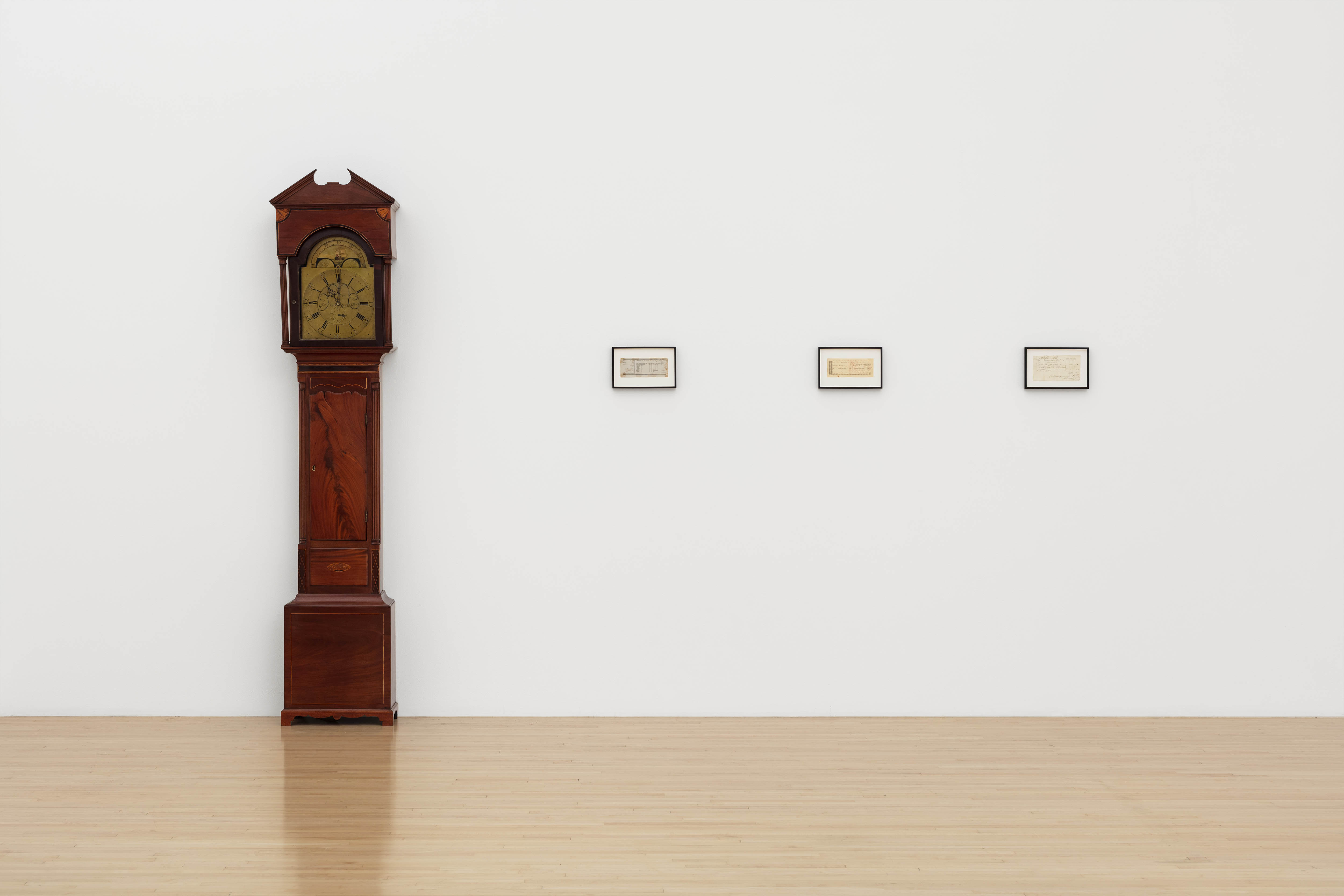 Rowland’s essay and captions provides a window onto the objects’ shared history, which is both fascinating and unsettling. The artist purchased the bicycles, the landscaping equipment, and the stroller at police auctions, a practice given context in the D37 pamphlet. If an individual is suspected of a crime or wrongdoing but not charged, punitive action may instead be transferred to that individual’s property (in rem) through civil asset forfeiture rather than to the individual (in personam). On a conceptual level, the transfer of punishment from person to property is perplexing. But more urgent, as Rowland corroborates through his research, is the reality that civil asset forfeiture is a policing practice that primarily targets and dispossesses minorities—a harrowing elision of object and person that recalls what Cheryl Harris has described as slavery’s “cruel tension between property and humanity.” In the gallery this tension is emphasized further in Assessment, which juxtaposes an eighteenth-century grandfather clock, acquired from a plantation, and nineteenth-century tax receipts that categorize slaves alongside assets such as clocks, carriages, and horses as taxable property.6 Indeed, turning his gaze back to the seventeenth century, Rowland traces the origins of civil asset forfeiture to maritime law, which introduced the seizure of commodities—including slaves—as a means to regulate triangular trade between England, West Africa, and the colonies. Through this prism, the forfeited and auctioned objects in the gallery seem less awkward than truly resigned. Their very presence is an extension of displaced punishment, redirected from absent bodies to material objects, and further still, transformed into financial gain. By virtue of circulation in police auctions, forfeited property generates funds for police departments and the Department of Homeland Security, who are both the enforcers and the financial beneficiaries of this particular “regime of property.”7