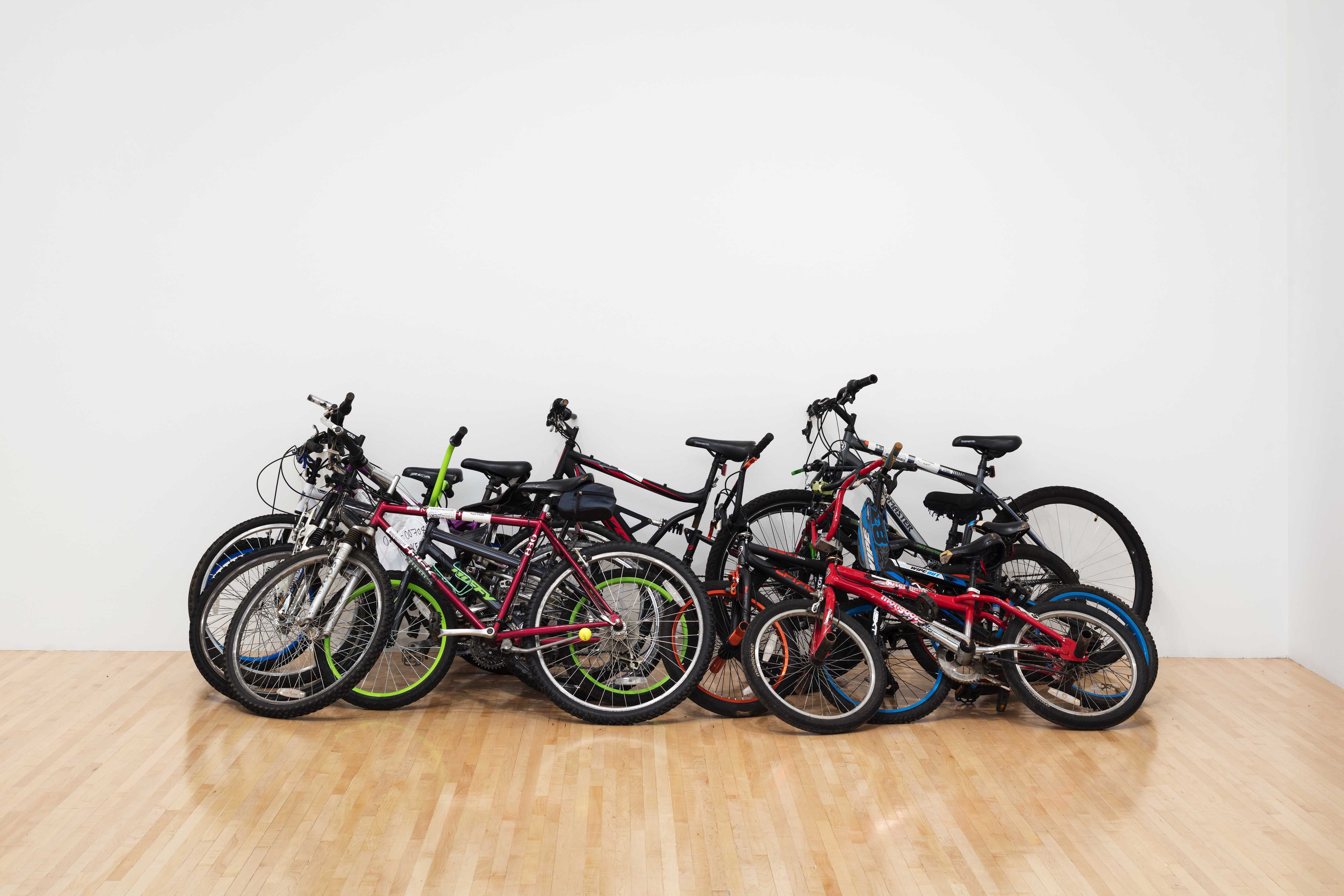 In the United States, most police auctions are run by private organizations that consolidate the forfeited property obtained by different police departments—an arrangement that centralizes the sale process and alleviates the operational burden for individual departments. One such organization, which Rowland studied, runs its sales through the website propertyroom.com. On the website, bidding on an inventory of primarily low-value assets is open to the public. (Typically, the seizure of low-value assets is not contested in court since the cost of litigation usually outweighs the market value of the item.) Previously called stealitback.com, the online platform is eerily modeled after eBay, with sales categories ranging from jewelry to vehicles to furniture to art. Rowland observed sales trends by visiting the warehouses where buyers collect their purchases and discerned popular categories of items. These trends informed his own bidding and purchases, and are reflected in the objects presented in the gallery. Importantly, Rowland also extends the conditions of the marketplace to the exhibition. The displayed objects retain their inventory tags while their titles and captions include warehouse inventory numbers, as well as final sale prices. And even the way these objects are installed in the gallery—the bikes clustered, leaning against a wall, for example—documents the condition in which Rowland retrieved them.8 (I found the presentation of bikes especially chilling in that they evoked not only the plunder of goods but also the sweeping plunder of childhood time.) In this way, he cuts through an enduring tradition of the sculptural readymade by attending to both the materiality and politicized financialization of dispossessed property.