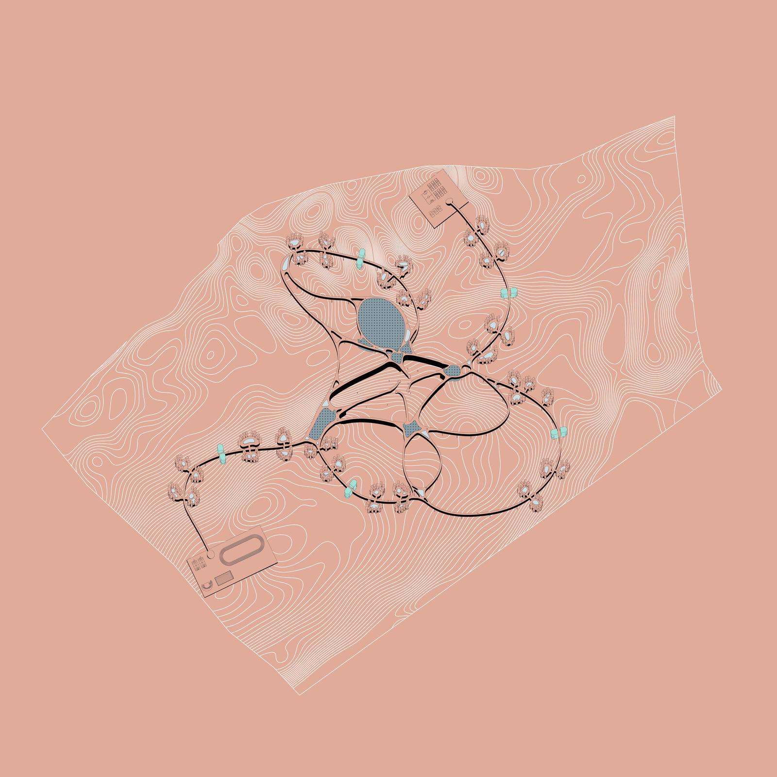 Dylan Seoyoon Lee’s project imagines the prison as clusters along an elevated pathway through the landscape, using the concept of mindfulness and the meandering patterns of bees as his guide. “It looks like an apartment complex,” says Dwayne Betts in the film. “I also thought it could be a golfing community,” the architect Tod Williams chimes in.