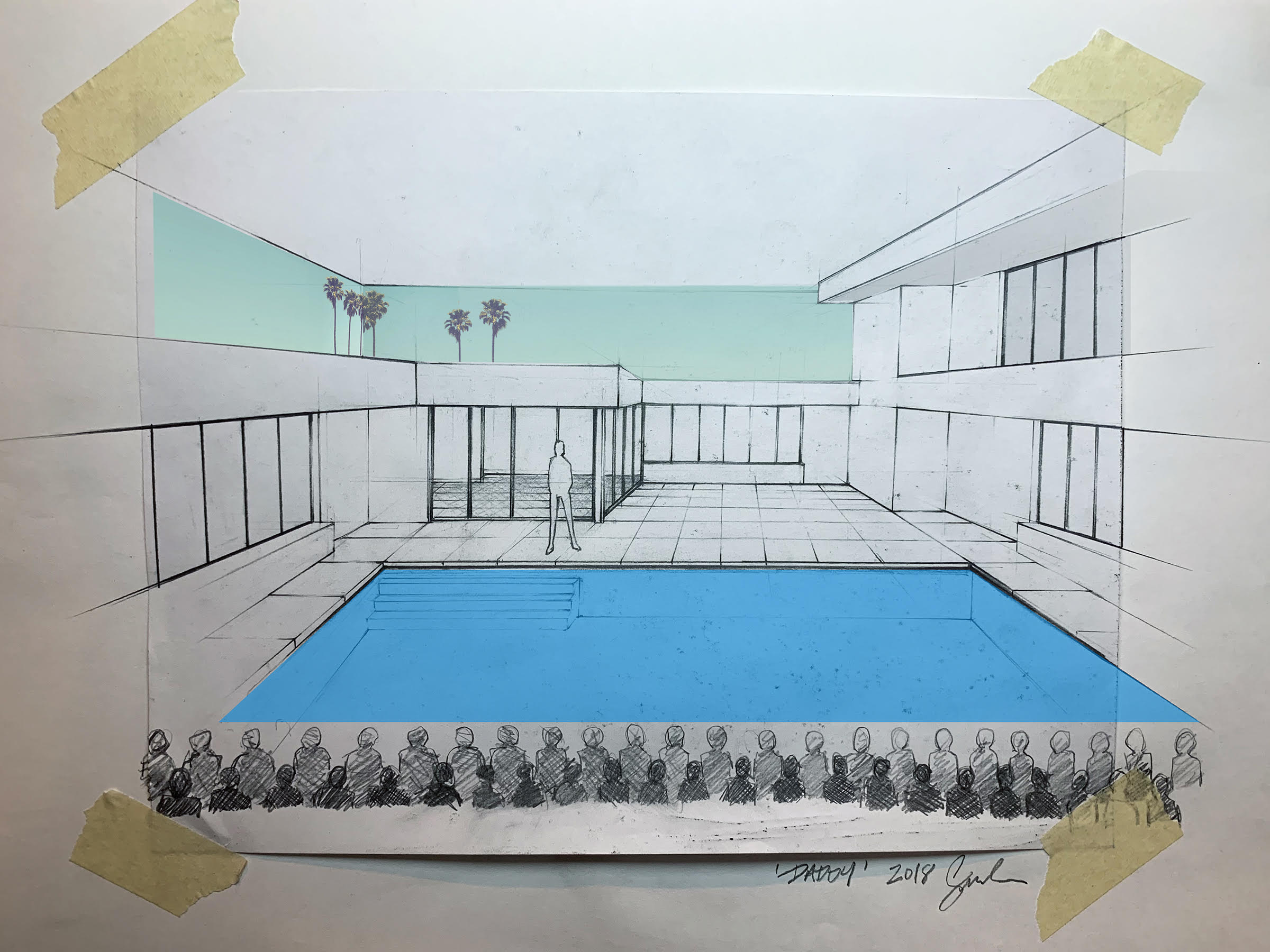 Jeremy O. Harris’s Daddy, the playwright’s latest work to open in New York, collides distant parts of the American landscape—the black American South and the ever-so-white Bel Air—in “distorted self-portraiture” of the script’s author, that also reflects the mode of collage that defines one of the play’s formative artistic precursors, David Hockney’s 1972 Portrait of an Artist (Pool with Two Figures).2 Daddy instrumentalizes the midcentury modernist villa, one of Los Angeles’s most enduring architectural tropes, as one of the play’s stars. Harris’s script engages on the one hand with the construction of a distinctly white, bourgeois class and on the other with the cult of the male body and the queer gaze, exacerbating the fracture between his characters and their attendant ways of life.