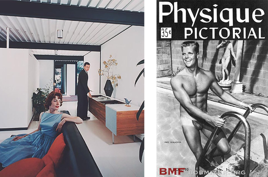 Julius Shulman, photographer of many of LA’s Case Study Houses, including the Koenig one that drew Hockney to California, was among the first of his generation to include people in his images, using architecture to stage a theater of domesticity. A couple sits down to eat while children play ping-pong (Mirman Residence); a woman sits on a couch in a blue dress while her suited husband puts a record on (Bailey House); a couple enjoy a cocktail poolside while a friend surveys the land beyond through a pair of binoculars (Stahl House). 20
