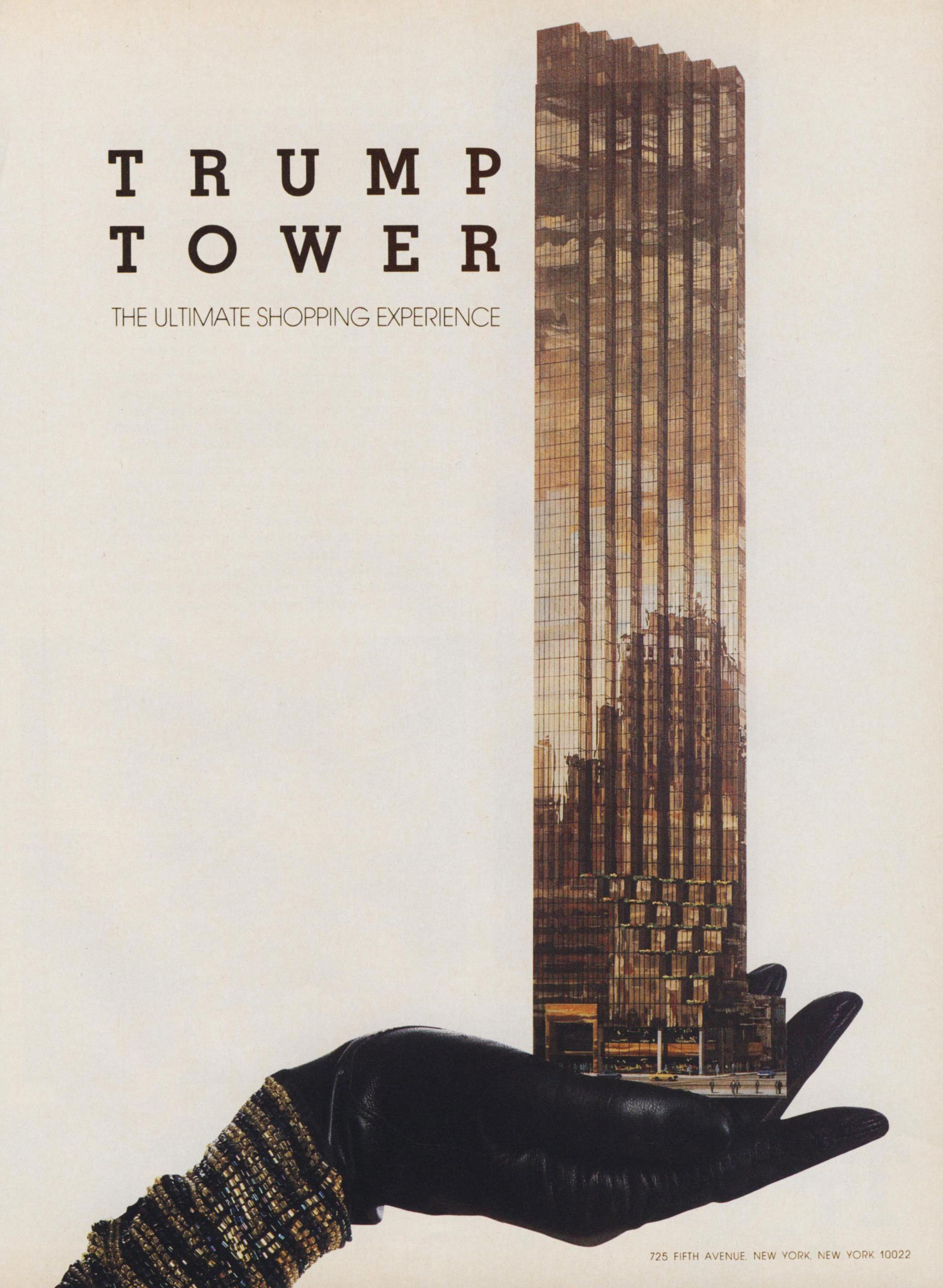 A collaged advertisement for Trump Tower from 1983, published in a multi-page insert in Vogue, allegorizes the air rights purchase from Tiffany & Co. as an offering on the part of the jeweler. The tower appears in miniature form, extending from the palm of an outstretched, leather-gloved hand, connected synecdochically to Tiffany & Co. via Audrey Hepburn’s evening-turned-morning-wear. The proportions of the tower have been exaggerated with the removal of horizontal mullions, and the addition of floors in order to correspond to Trump’s inflated, and self-evidently false, claim that the building is actually sixty-eight stories high.