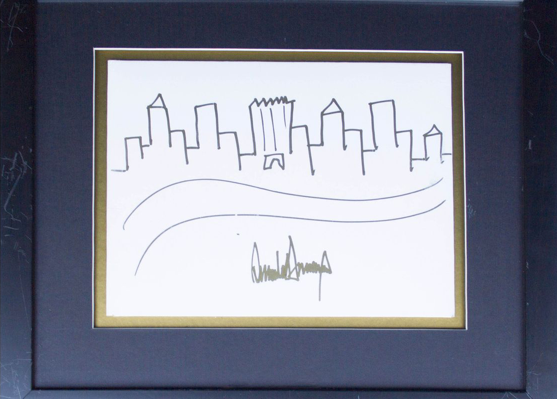 Trump’s de-emphasis of the context of the tower is typical among his limited set of architectural sketches. In an additional sketch of the Empire State Building from 1990, auctioned in 2017, the tower is rendered as isometric, projected from a scribbled ground plane that merges with his signature. ↩