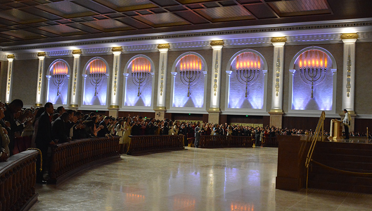 There is even a dress code, ensuring that any and all sumptuousness is left for decoration. This ornamentation includes golden, palm-tree-shaped columns guarding the altar—their chapters resemble pineapples more than anything else. Six huge golden menorahs on each side of the nave that are lit with a candle-like effect by LED lamps. Camouflaged doors seemingly melt into the stone-plated walls. If big and brilliant religious architecture is used to synthesize an age’s culture and technical achievements, could the particular taste exhibited here be said to synthesize our contemporary accomplishments?