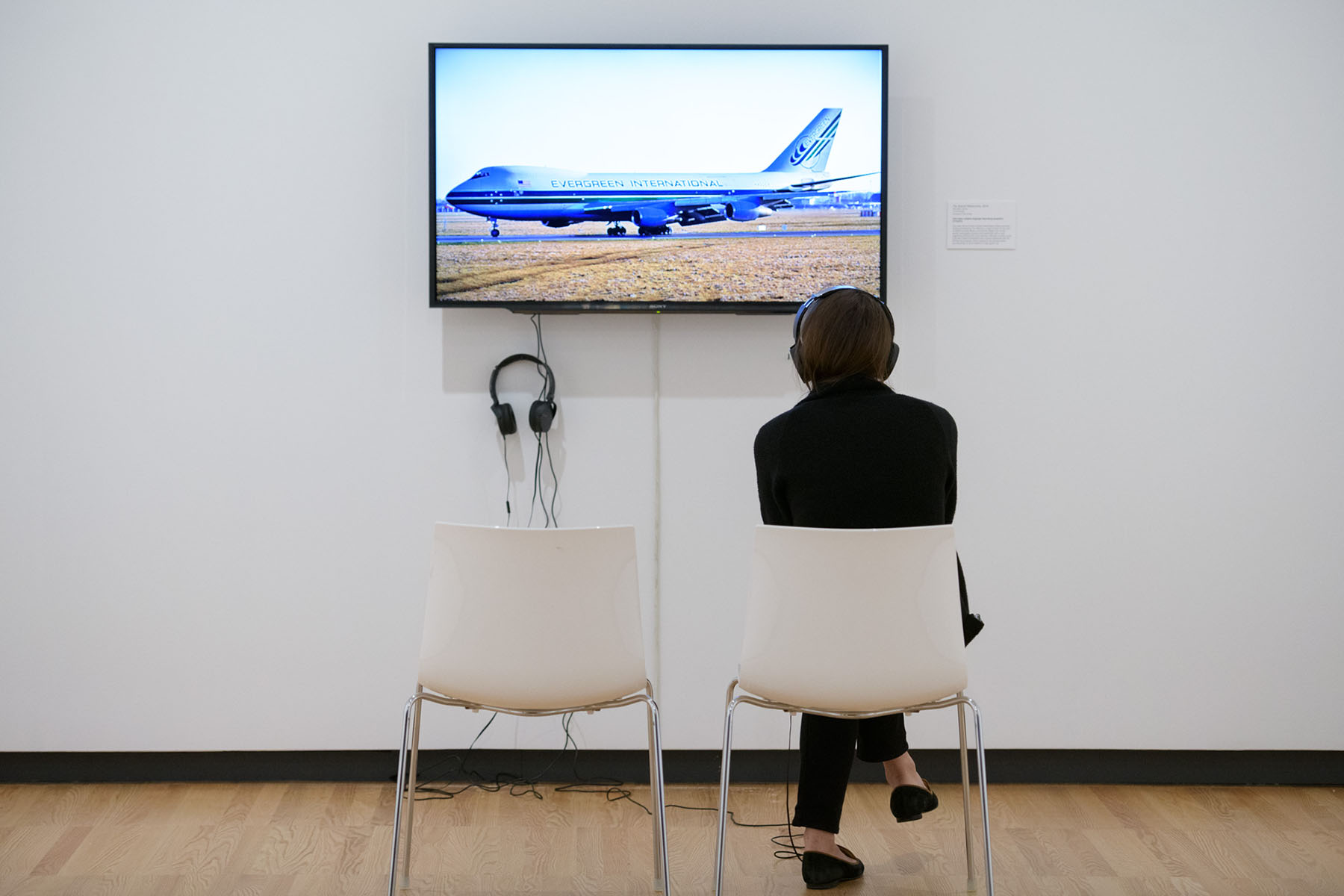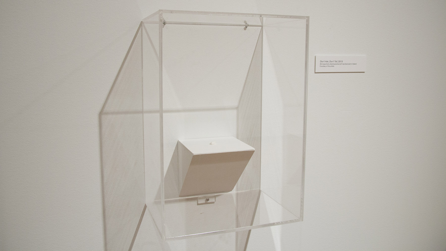 A single pill in the display case near the map, titled Don’t Ask, Don’t Tell, is an anti-psychotic pill manufactured in Ireland. The solitary display hinges between the map and the video display of photographs created in 2013 as The Special Relationship. For four minutes the display cycles through photographs of mainly charter aircraft from Omni Air International and World Airways, among others, that are used to ferry US military personnel taking off, landing, or standing at Shannon Airport between October 2001 and October 2013. Rather than taking the images themselves or sourcing images from anti-US military activists, Kennedy Browne sought permissions from an aviation photo website based in Ireland. Out of 117 requested images taken by twenty photographers, seven photographers of forty-two images granted permission, while six photographers of thirty-seven images explicitly denied permission. As the series of images progresses, a woman’s voice reads a list of interview questions adapted from a seventeen-point PTSD Symptom Scale developed in 1993. Questions such as “Have you had recurrent or intrusive distressing thoughts or recollections about the event?” or “Have you had persistent difficulty concentrating?” connect the experience and trauma of a continuous war on terror with attempts at its treatment, as well as the ongoing emphasis on economic development through foreign investment.
