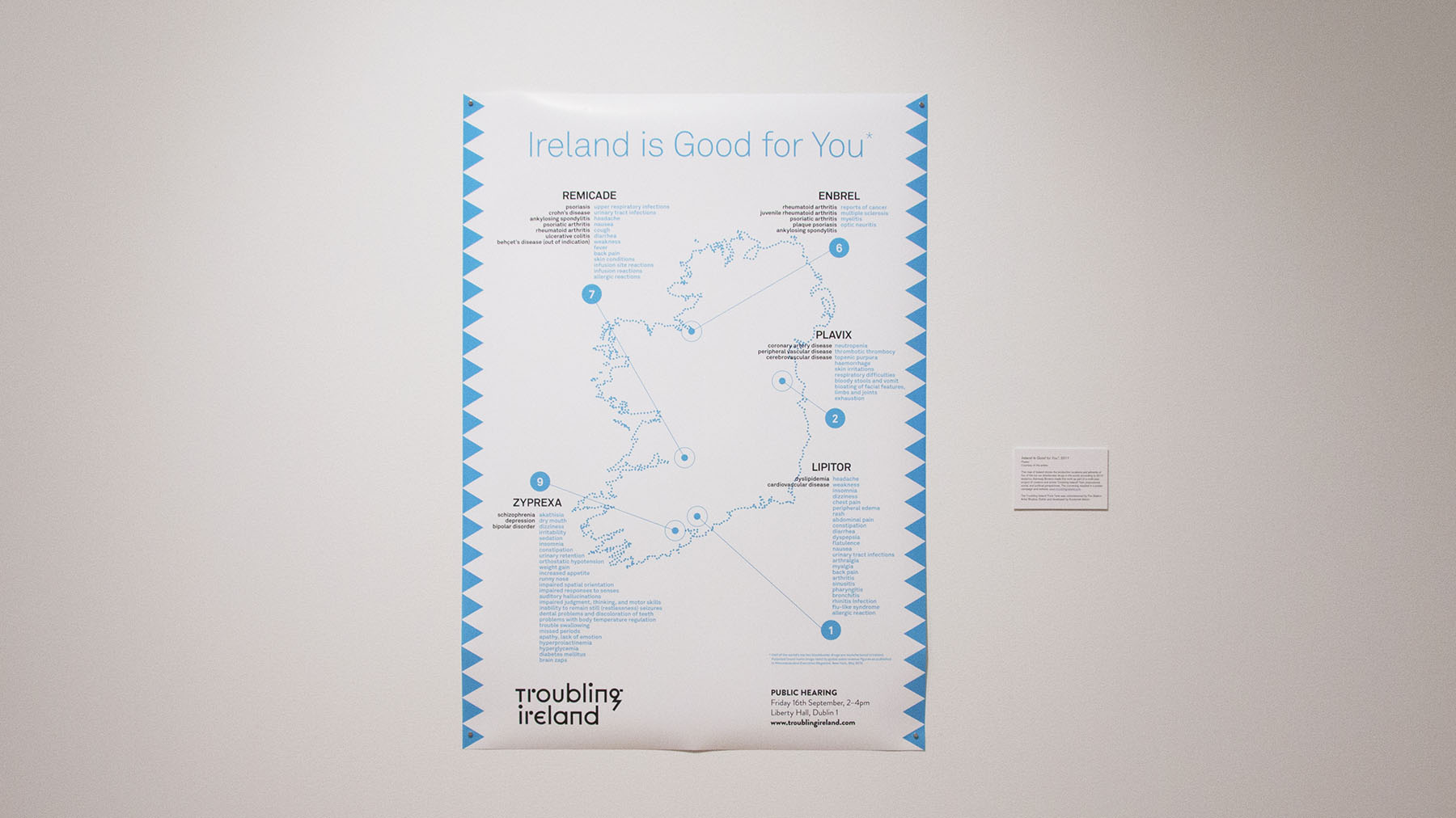 In Kennedy Browne’s map of Ireland that announces “Ireland Is Good for You*,” spots on the map point not to specific cities but locations of pharmaceutical plants. A dot south of Dublin is labeled “Plavix,” a drug to treat individuals at risk of heart disease or stroke. Two columns beneath the label outline prescribed and off-label uses followed by a generally longer list of the variety of side effects. The Eli Lilly plant near Cork produces Zyprexa, used to treat schizophrenia, depression, and bipolar disorder. The list of the drug’s side effects runs to twenty-five items including dry mouth, impaired spatial orientation, diabetes, and “brain zaps.” Numbers corresponding to each location point to the fact that in 2010 a pharmaceutical trade journal announced that five out of the top ten drugs based on global sales revenue were manufactured in Ireland, including the top two (Lipitor, now out of patent, and Plavix).11 Pfizer now produces the active ingredient for Viagra in Cork.