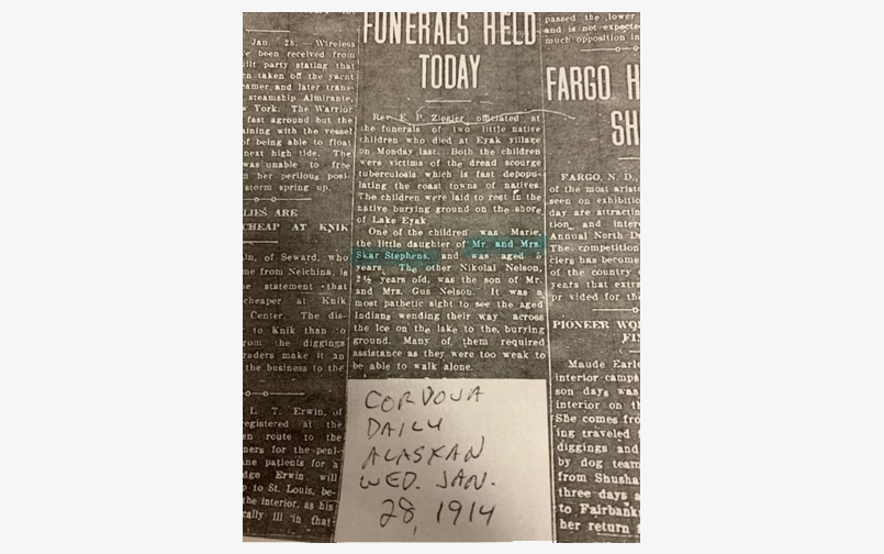For instance, by 1914, dAXunhyuu of the Eyak Lake area had already been hit hard by tuberculosis. A newspaper clipping from January of that year reads, “Rev. E. P. Ziegler officiated at the funerals of two little native children who died at Eyak village Monday last. Both the children were victims of the dread scourge tuberculosis which is fast depopulating the coast towns of natives. The children were laid to rest in the native burying ground on the shore of Lake Eyak.”