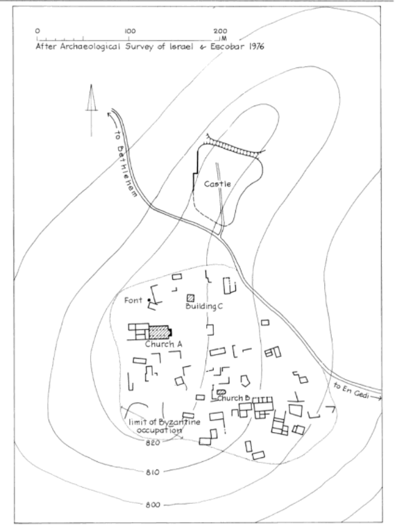 Plan of Taquu from the Tekoa Archaeological Expedition Survey, including the original location of the baptismal font in the Palestinian village. Courtesy of Martin Heicksen, Tekoa Archaeological Expedition Survey.