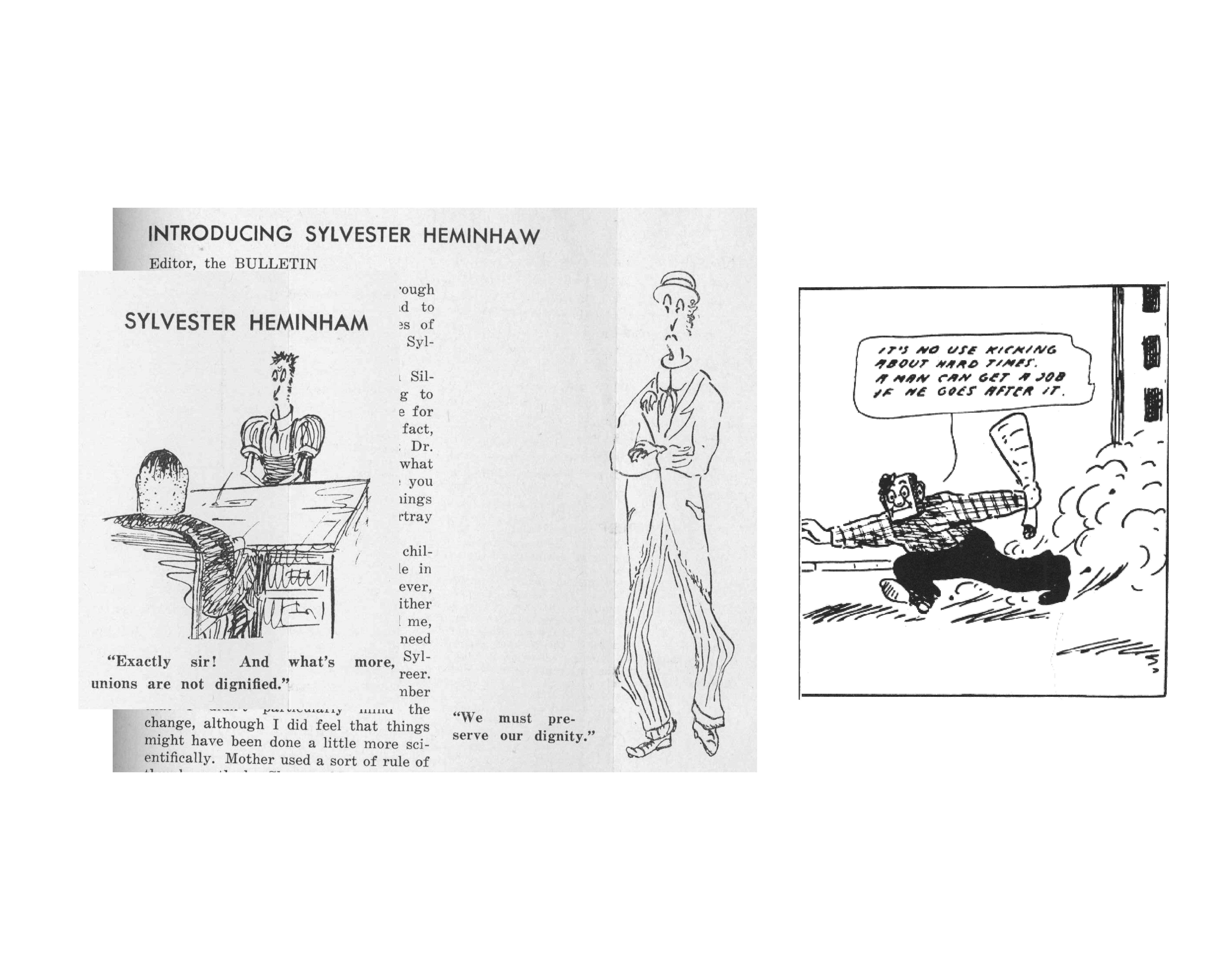 Continuing in the tradition of the International Workers of the World (IWW), the Bulletin used satire for political effect. FAECT Bulletins pictured here: “Sylvester Heminhaw,” September 1936; “Question—If we have slum clearance, where will Architects live???” June 1935; Sylvester Heminhaw, October 1936, Mr. Block.