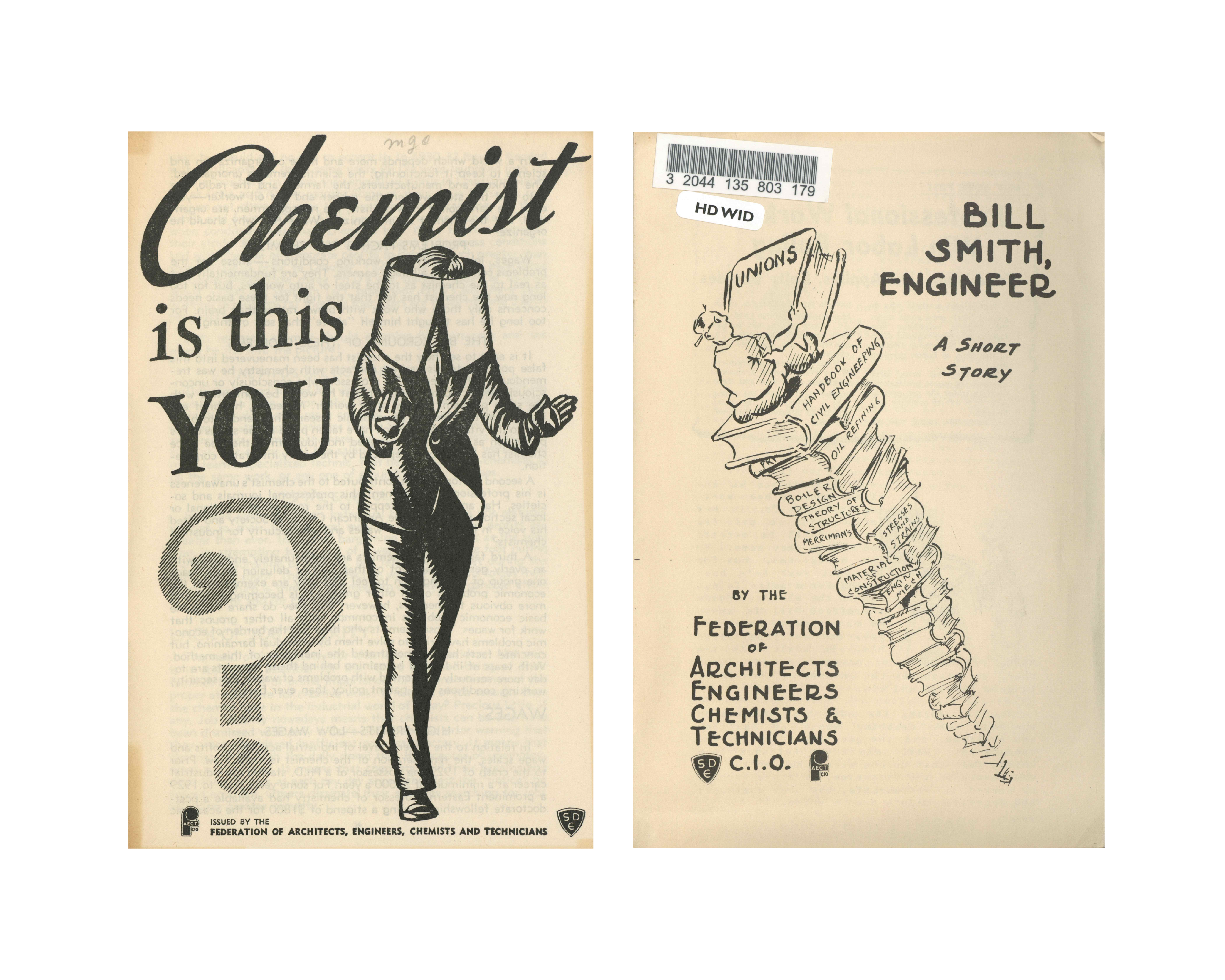 Two pamphlets published by FAECT demonstrate different tactics used to appeal to potential members. “Bill Smith, Engineer” is an illustrated short story of a downtrodden worker who joins FAECT and wins back pay for him and his coworkers. “Chemist, Is This You?” meticulously describes the poor working conditions and low wages faced by chemists and academics, while the cover humorously illustrates a worker blinded by his own white collar.