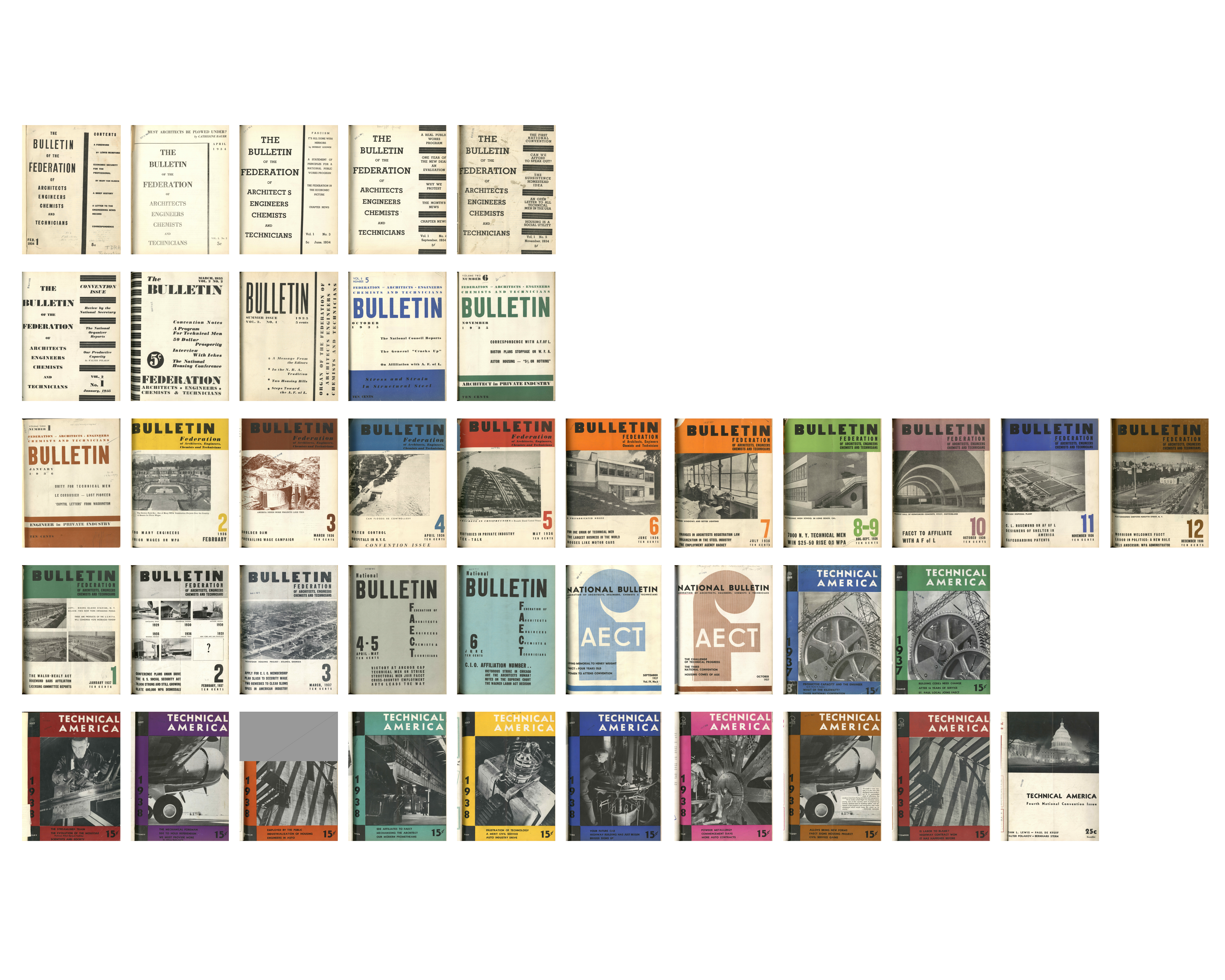 Cover pages of FAECT Bulletin, and later Technical America, from 1934 to 1938.