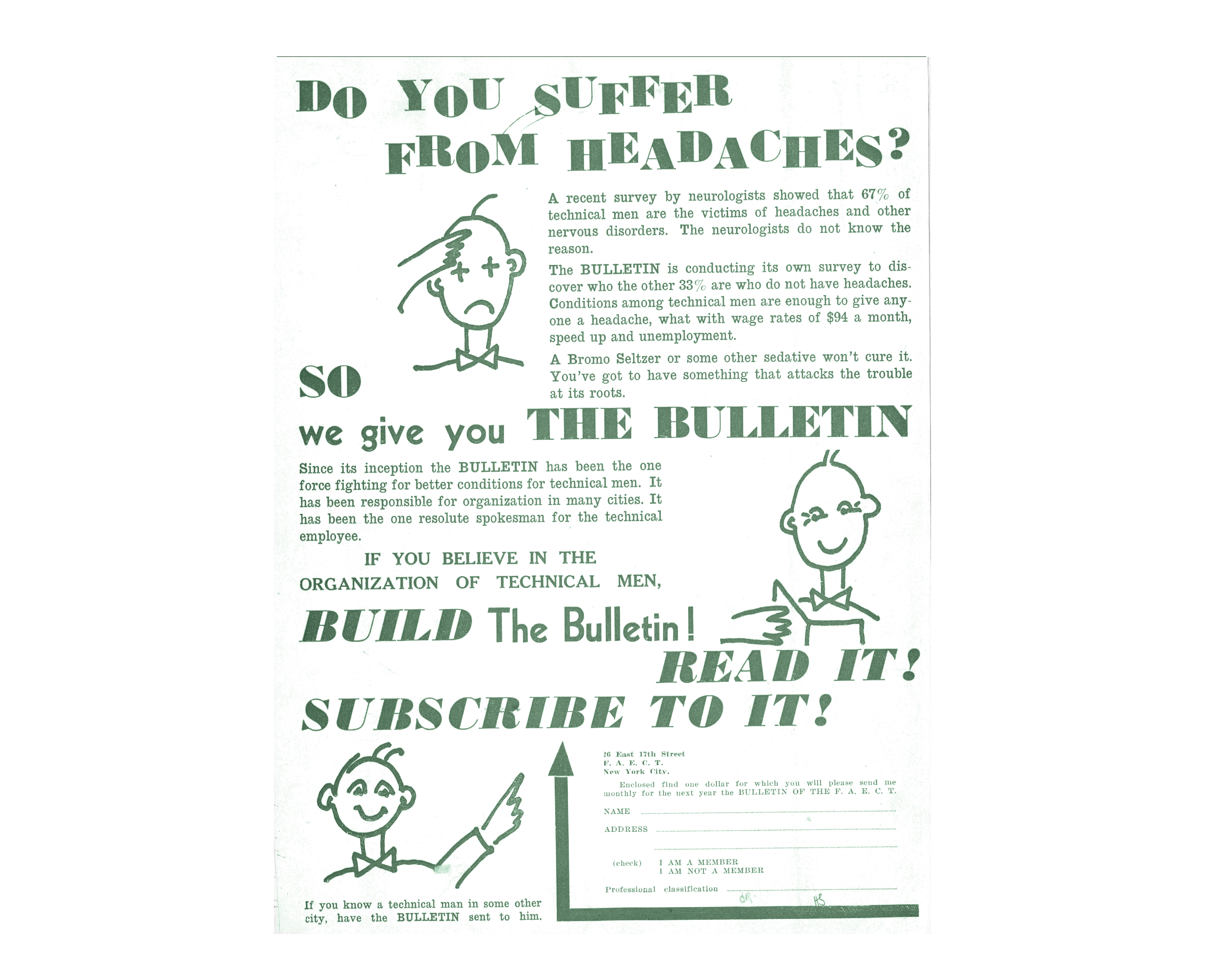 The first issue of the FAECT Bulletin, from February 1934, ends with correspondence from an employer: “Permit me to congratulate you upon your correct decision not to accept me as a member of your organization. This action proves to me, to my great satisfaction, that four years of starvation has finally taught you the lesson that architects or engineers, or chemists, are not one great big happy family…”