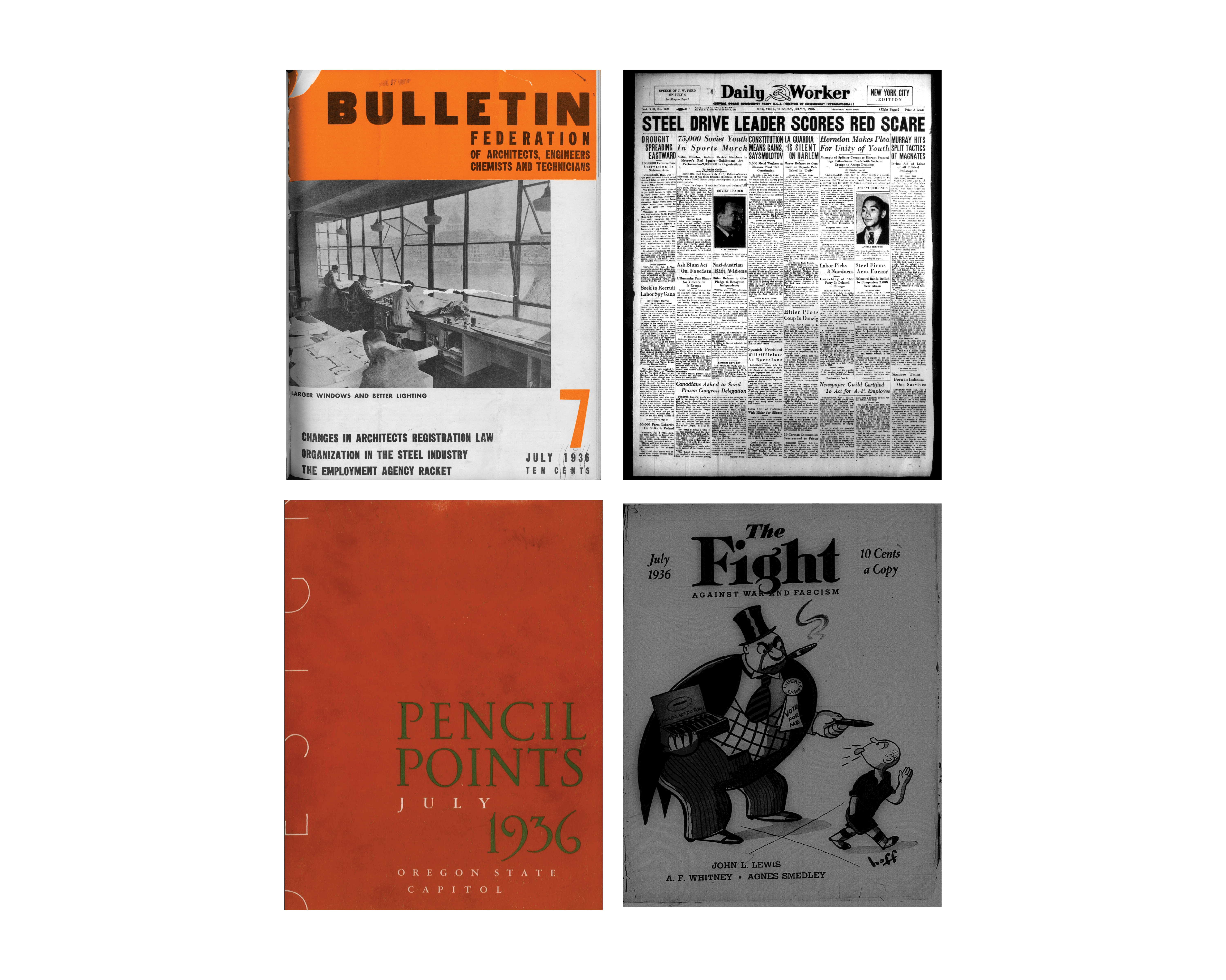 Issues of the FAECT Bulletin, Pencil Points, and Engineering News-Record from the summer of 1936. FAECT’s Bulletin picks up on the formation of the Steel Workers Organizing Committee within the CIO, as does the Daily Worker. Pencil Points prints “Monograph series.”