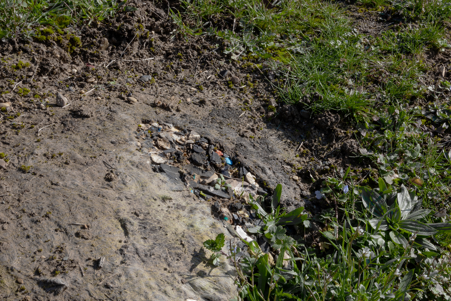 In early November, I make my next visit to Belvedere in Maastricht, a former 20-hectare landfill in the south of the Netherlands. There, I am greeted by Bas, who works for Bodemzorg (this translates roughly as Soilcare). A zoologist by training, his work is now caretaking this postnatural landscape near the river Maas, as well as fourteen others across the region. While his official title is project manager, I think of him as the carer of the mountain. Part of Belvedere is publicly accessible as a recreational area, but its 52-meter-high plateau was closed off two years ago. In lieu of reaching it, visitors may now marvel at a field of solar panels stretching out as far as the eye can see.75 As we reach the northern slope, I get a rare glimpse of the topography’s secret: the geomembrane. Erosion has exposed it. Next to me, Bas reaches down and nonchalantly pulls off part of the top layer for me to keep. It is a colorful rubber composite and a thin layer of woolly material still carrying bits of topsoil. Below me lies the last layer, a black plastic sheet: the center-sealing component of the landfill. Across the globe, there are many variations of the geomembrane—more a category than a single material component—from black, bendable plastic sheets to plastic grids cushioned with water-absorbent fabric liners. Whatever its composition, the intention is the same: to keep the buried strata, gases, and leachate under control.76 I study my newly acquired souvenir. It seems almost absurd that these three layers are all it takes to maintain the borders of Belvedere. Bas brushes his hands off and seems to notice what I am thinking: “No need to redo the full membrane,” he says. A few heaps of soil will do. Tackling erosion is simply part of “nature management.”77 Curiously, the term also includes contracting more-than-human workers: long-haired French goats whose primary duty is to keep grass levels low.78 Despite this cost-effective measure, they do come with some risk as their trampling over the slopes may increase erosion on the delicately engineered mountain.79 Even though geomembranes are state-of-the-art devices, they too can break.80