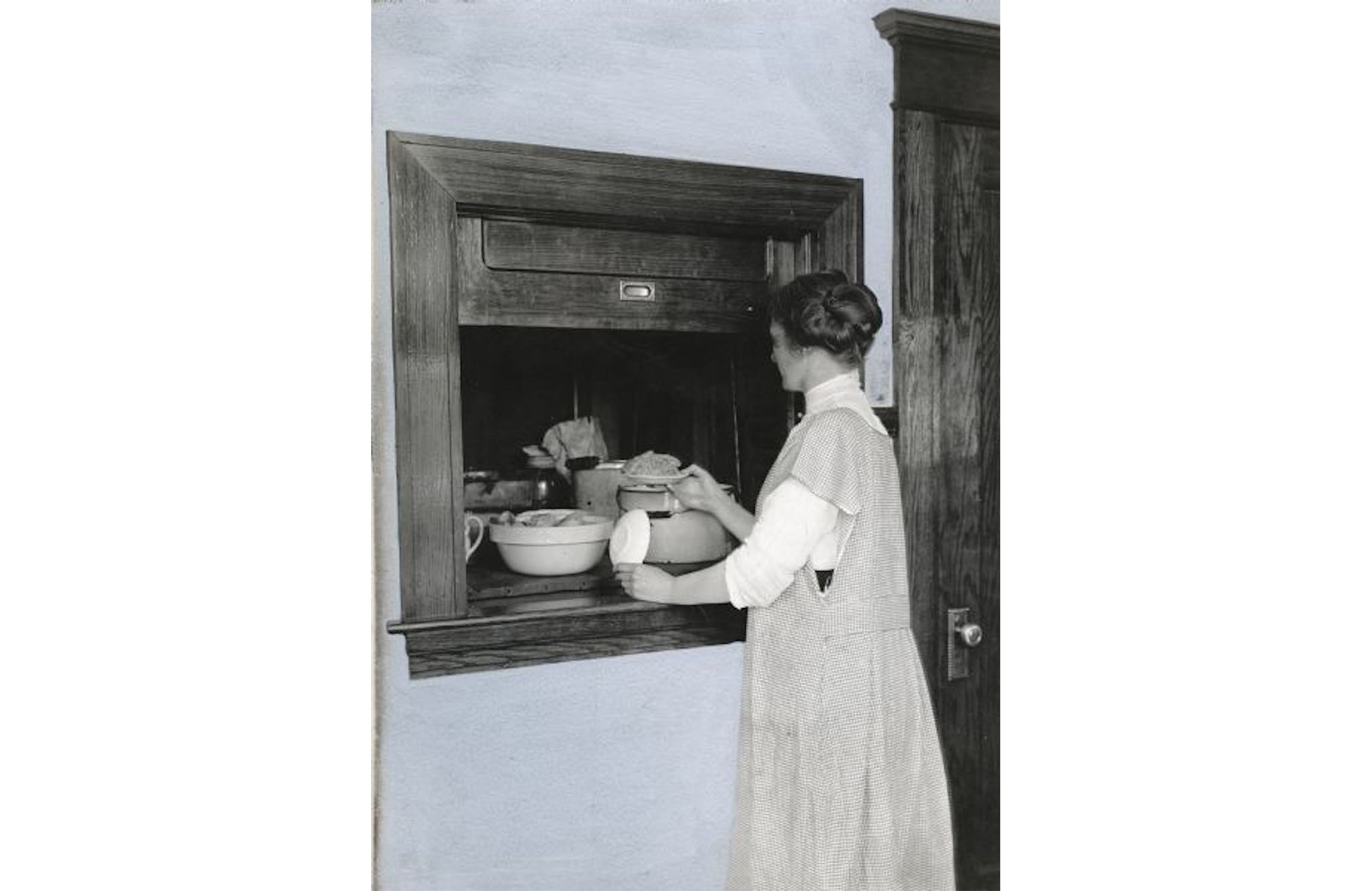 The image of a woman waiting by the dumbwaiter persisted into the twentieth century, even as dumbwaiters became increasingly powered by electricity rather than by humans. In 1920, International Harvester Company, an American manufacturer of agricultural equipment, commissioned a series of photographs documenting domestic labor through its Agricultural Extension Department.20 One of the photographs, titled “Dumb Waiter in Farm Home of Mrs. John Bowers,” portrayed a woman unloading food from a dumbwaiter cart.21 The image is filed under folder “Home Economics” in the company’s photo collection. Documenting household routines in farmhouses across the United States, the series set out to evaluate, regulate, and promote “good domestic practices.” This intent was made evident through the original typewritten caption of another photo in the same collection, which depicts a sanitary garbage pail attached to a kitchen sink: “Kitchen Katch-all. If farm women gave a little more time and thought to the equipment in their kitchen much of the so-called drudgery would be eliminated.”22 Kitchen tools like the dumbwaiter and garbage pails were advertised to assist “the farmers and their wives” to “have better farms, better schools, better health, and better homes.”23 Printed next to modernized farming equipment in International Harvester’s promotional materials, the photograph of Mrs. Bowers operating the dumbwaiter signaled a new ideal of efficiency in American homes.