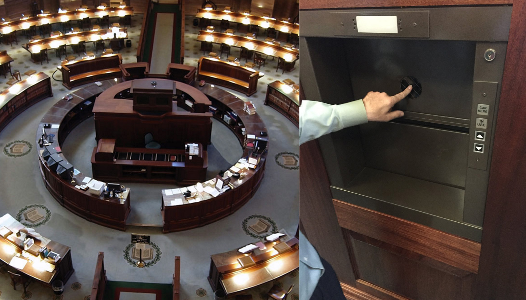 A 2016 article published on the website Architect of the Capital provides a history of this information infrastructure.46 Whenever a book request was placed from the Capitol, the circulation desk received the volume from the stacks via a system of conveyor belts. “Through a dumbwaiter located in the boxy central cabinet,” the book descended to the control room below, where it was placed on a special carrier to be sent to the Capitol.47 Though the dumbwaiter was recently refurbished, the connected pneumatic tubes, conveyor belts, and book tunnels have either been removed for the Library of Congress’s new visitor center or fallen into disrepair since the early 2000s.48 “Frozen between the forces of bureaucratic inertia and historical preservation,” the dumbwaiter no longer delivers books and remains a mere visual detail in the reading room.49